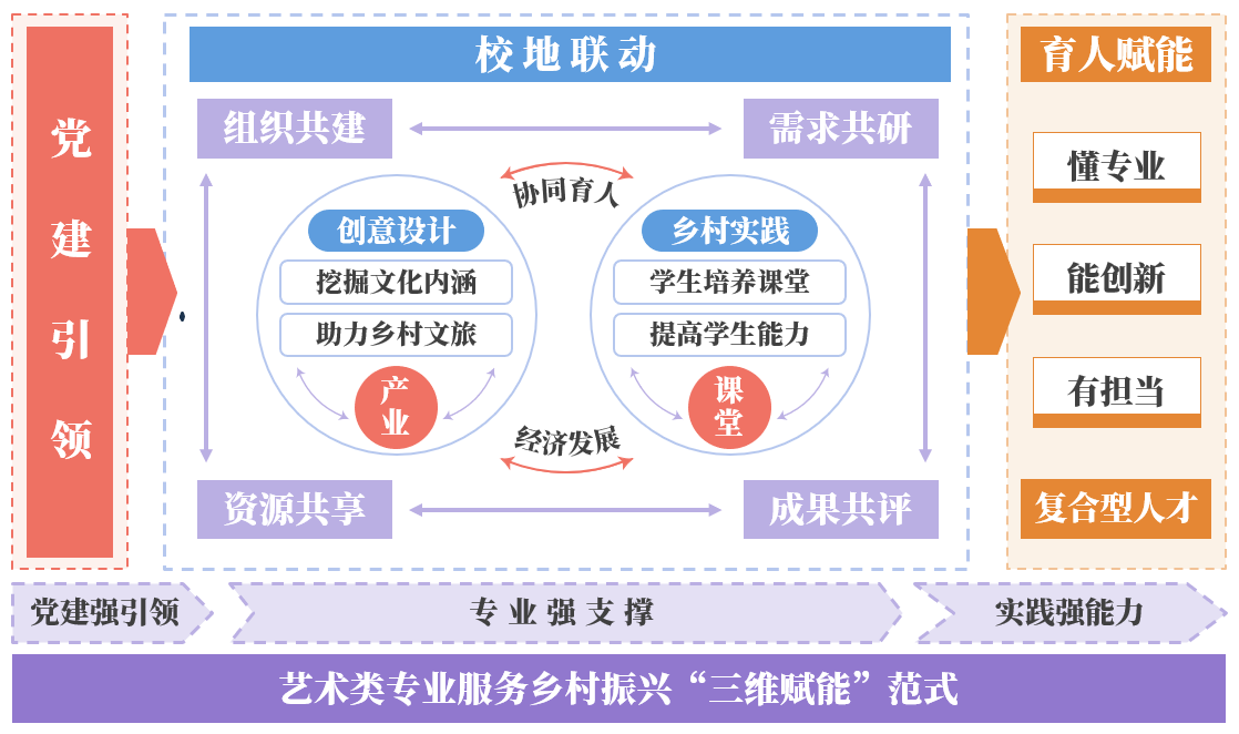 视传党支部以“党建引领、校地联动、育人赋能”为主线,聚焦“组织共建、需求共研、资源共享、成果共评”四大维度,通过创意设计和实践服务,助力乡村打造特色产业、挖掘文化内涵、提升旅游品质,推动乡村经济社会发展。同时,将乡村实践作为学生培养的重要课堂,提高学生的专业实践能力、创新思维和社会责任感。形成“党建强引领、专业强支撑、实践强能力”的校地协同育人长效机制,为乡村振兴输送“懂专业、能创新、有担当”的复合型人才,打造可复制、可推广的艺术类专业服务乡村振兴“三维赋能”范式。