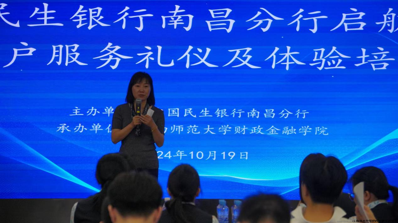 2024年10月19日上午9时,由中国民生银行南昌分行主办、江西师范大学财政金融学院承办的中国民生银行南昌分行启航计划客户礼仪服务及体验培训在中国民生银行南昌分行举行。本次培训活动由江西师范大学财政金融学院教授钱颖授课,来自全省各级分行员工170余人通过线上线下相结合的方式参加此次培训。
