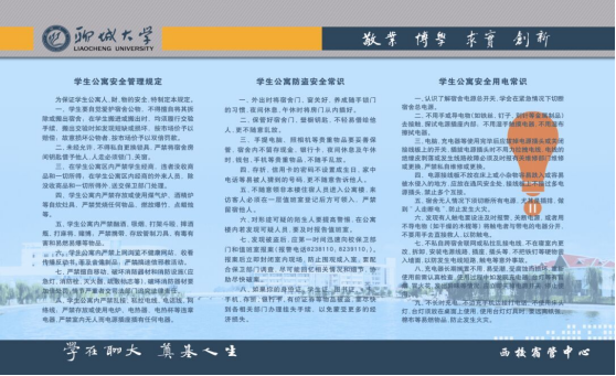 聊城大学认真贯彻落实中央、省市关于安全生产工作的各项文件精神,始终坚持“安全第一,预防为主,综合治理”的安全管理方针,注重把安全教育、安全管理、安全文化贴近学生实际、需求和成长,在教育、管理、服务中实施学生宿舍14435安全工程建设,引导学生健康、安全成长,努力创建安全、文明、和谐的学生社区。