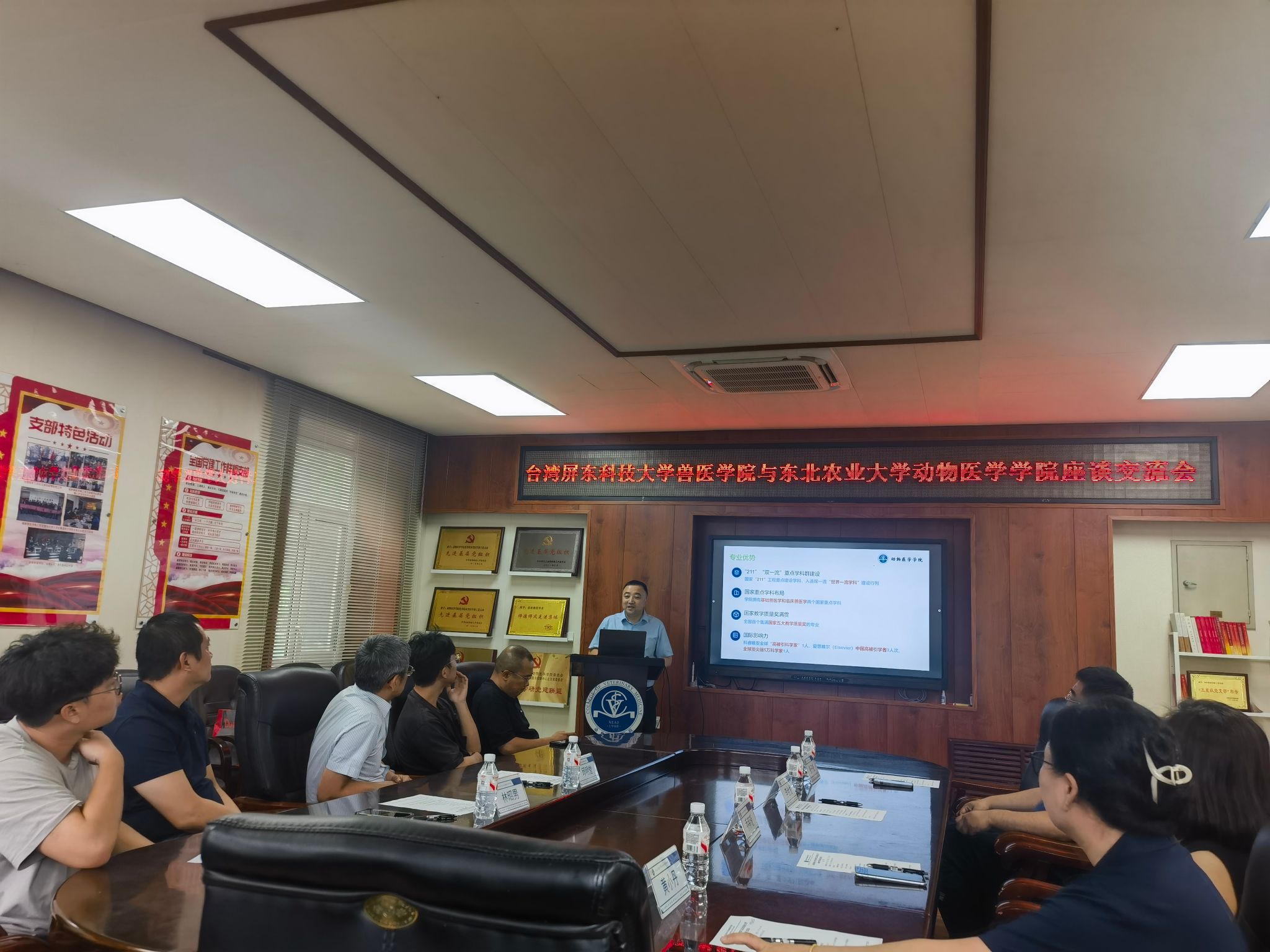 双方在临床楼229会议室开展座谈交流。座谈会上,临床兽医学教工党支部教师李金龙首先代表东北农业大学动物医学学院对台湾屏东科技大学兽医学院邱明堂院长一行的到来表示热烈欢迎,并详细介绍了学院的整体办学情况。他从学院的历史沿革、学科设置、师资力量、科研平台、人才培养模式、对外合作交流等方面进行了全面阐述,重点介绍了学院在动物疾病防治、临床诊疗、基础医学研究等领域的特色和优势。