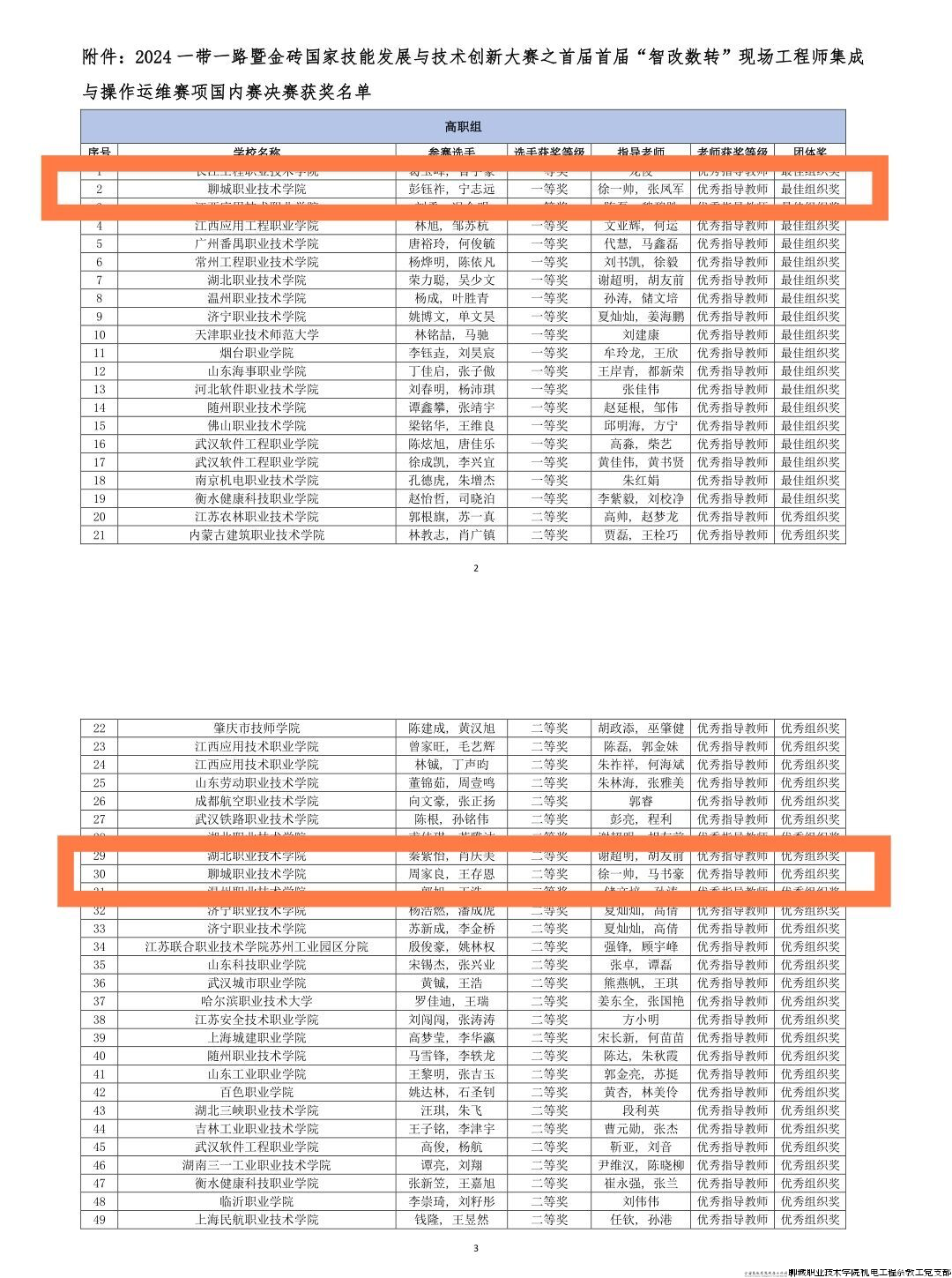 聊城职业技术学院智能制造学院教工党支部指导学生在一带一路暨金砖国家技能发展与技术创新大赛首届“智改数转”现场工程师集成与操作运维赛项中获得一等奖1项、二等奖1项,3人获得“优秀指导教师”称号,聊城职业技术学院获得“优秀组织奖”。