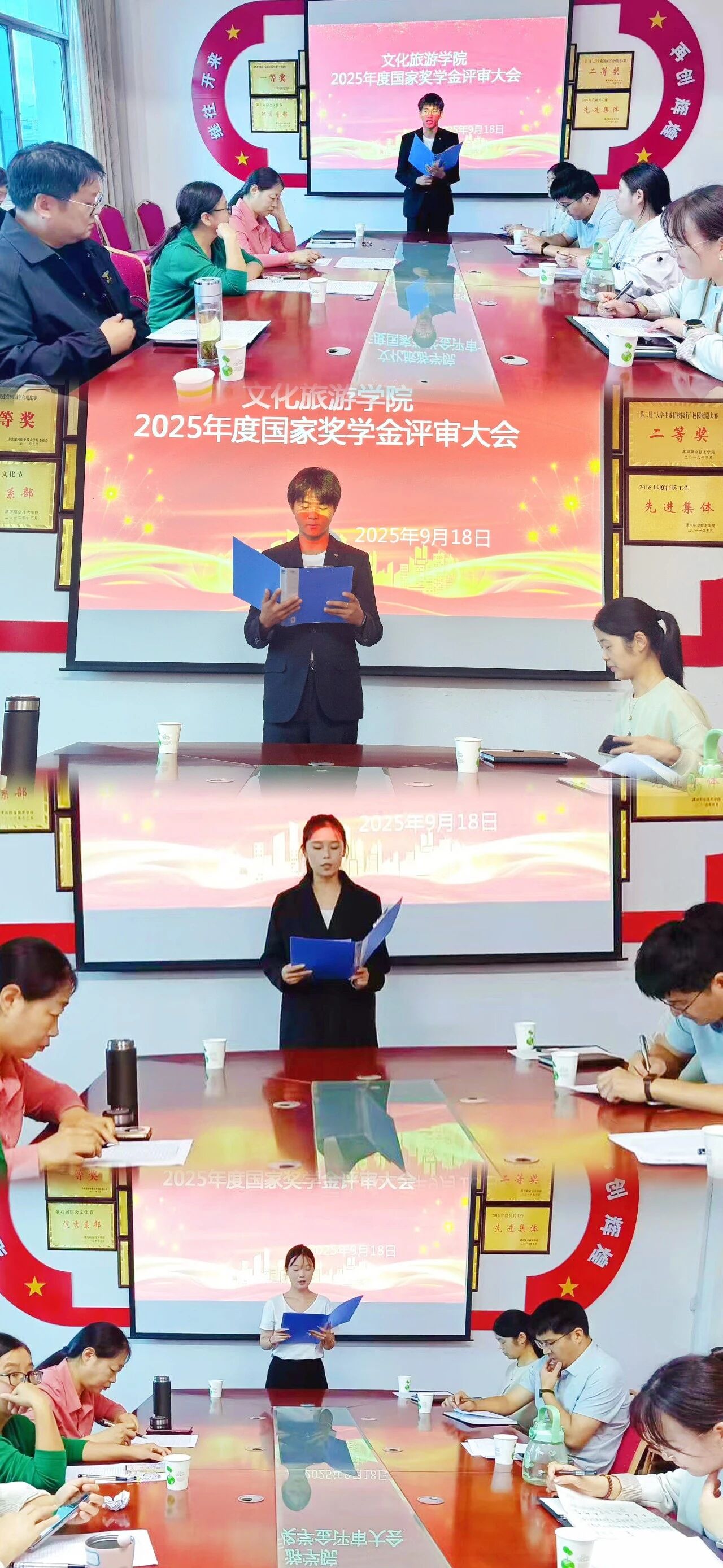 为全面落实国家奖学金评审工作要求,充分发挥奖学金的育人导向与激励作用,文化旅游学院于9月18日下午在学院会议室召开2025年国家奖学金评审会议。文化旅游学院党总支书记王树杰、院长冯俊强、党总支副书记潘智睿、副院长李晓静、学生处陈洪涛、教师代表及全体辅导员参加评审。会议由资助专员肖丹主持。