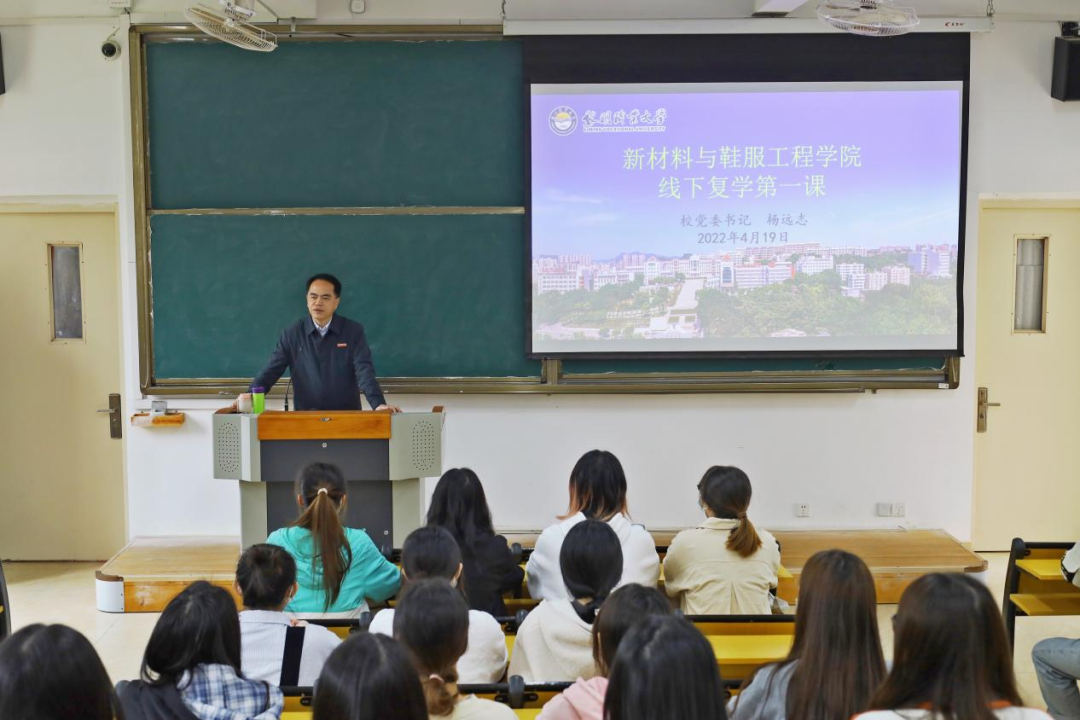 告别云端,相聚课堂。经历了一个月艰苦卓绝的抗疫,校园逐步恢复生机与活力。4月19日上午,校党委书记杨远志,同时也是新材料与鞋服工程学院教工党支部党员,走进课堂,为新材料与鞋服工程学院20级服装设计与工艺1班学生讲授“线下复学第一课”。