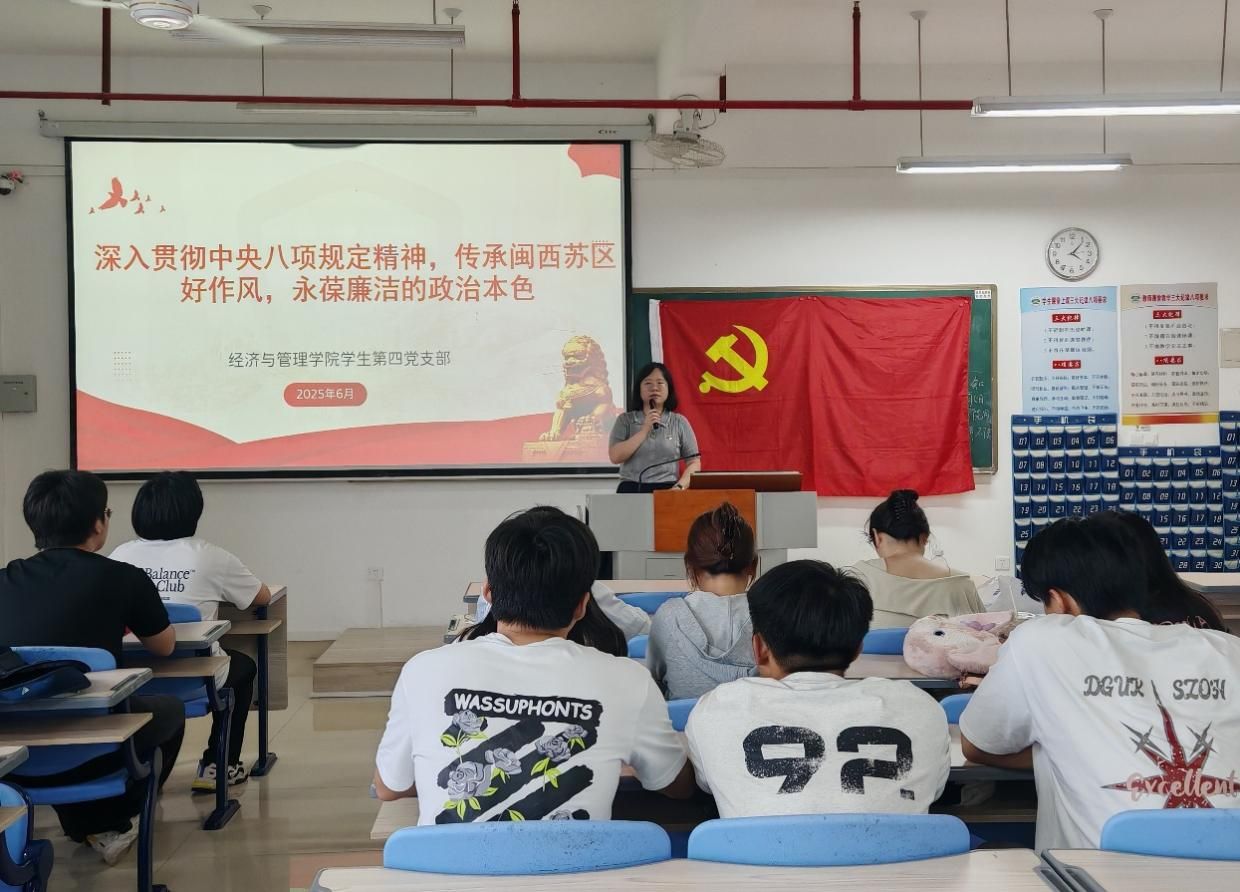 为推动深入贯彻中央八项规定精神学习教育走深走实,切实增强学生党员的纪律意识和廉洁意识,持续加强党支部作风建设。6月5日经济与管理学院学生第四党支部在厚德楼301开展专题党课。学生第四党支部书记张璐滢以“深入贯彻中央八项规定精神,传承闽西苏区好作风,永葆廉洁的政治本色”为题进行授课,支部全体党员参加学习。