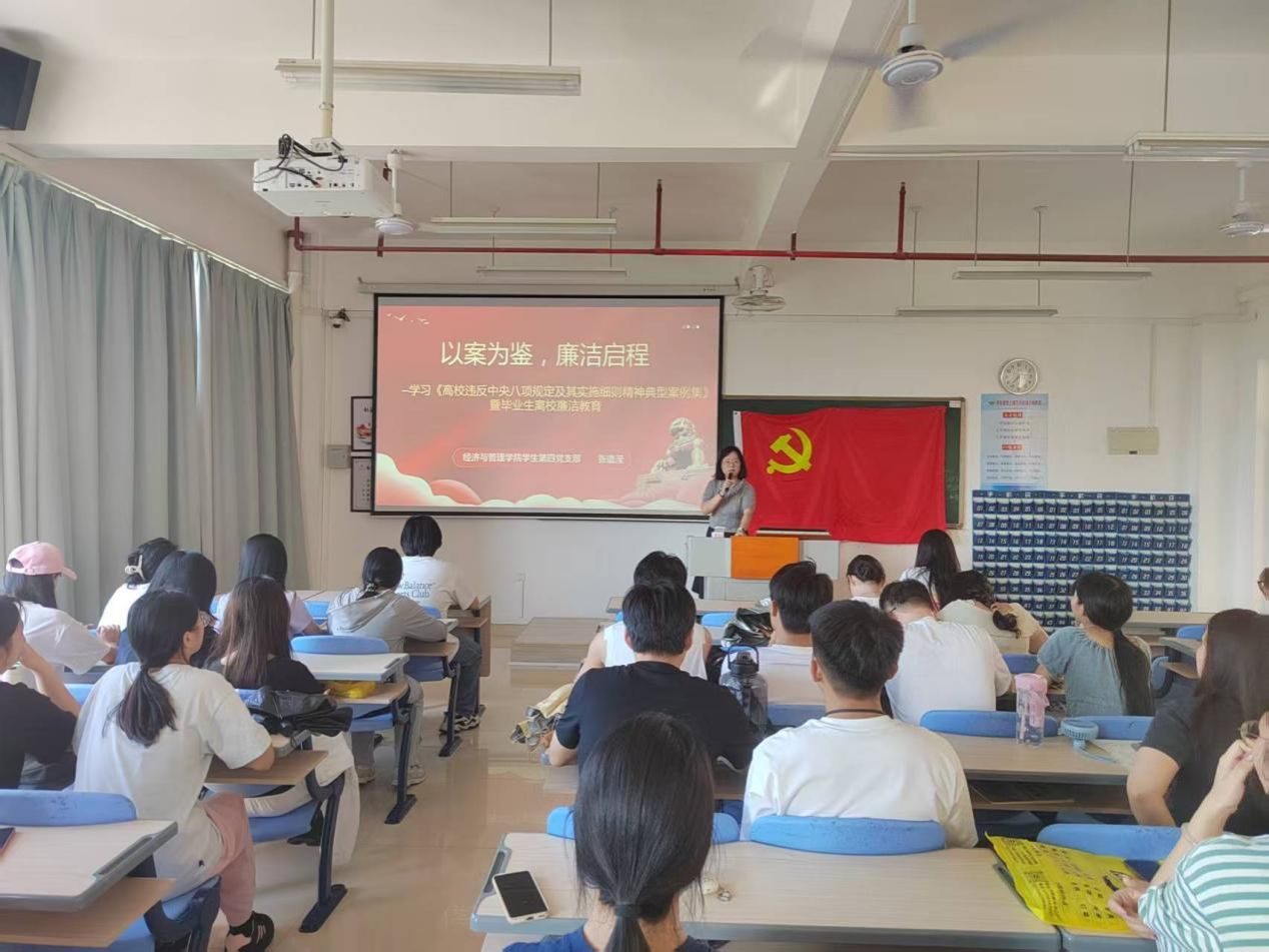 为深入贯彻中央八项规定精神学习教育,进一步强化全体党员廉洁自律意识。6月12日经济与管理学院学生第四党支部在厚德楼401开展“以案为鉴,廉洁启程”活动。学生第四党支部书记张璐滢主持,支部全体党员共同参加。