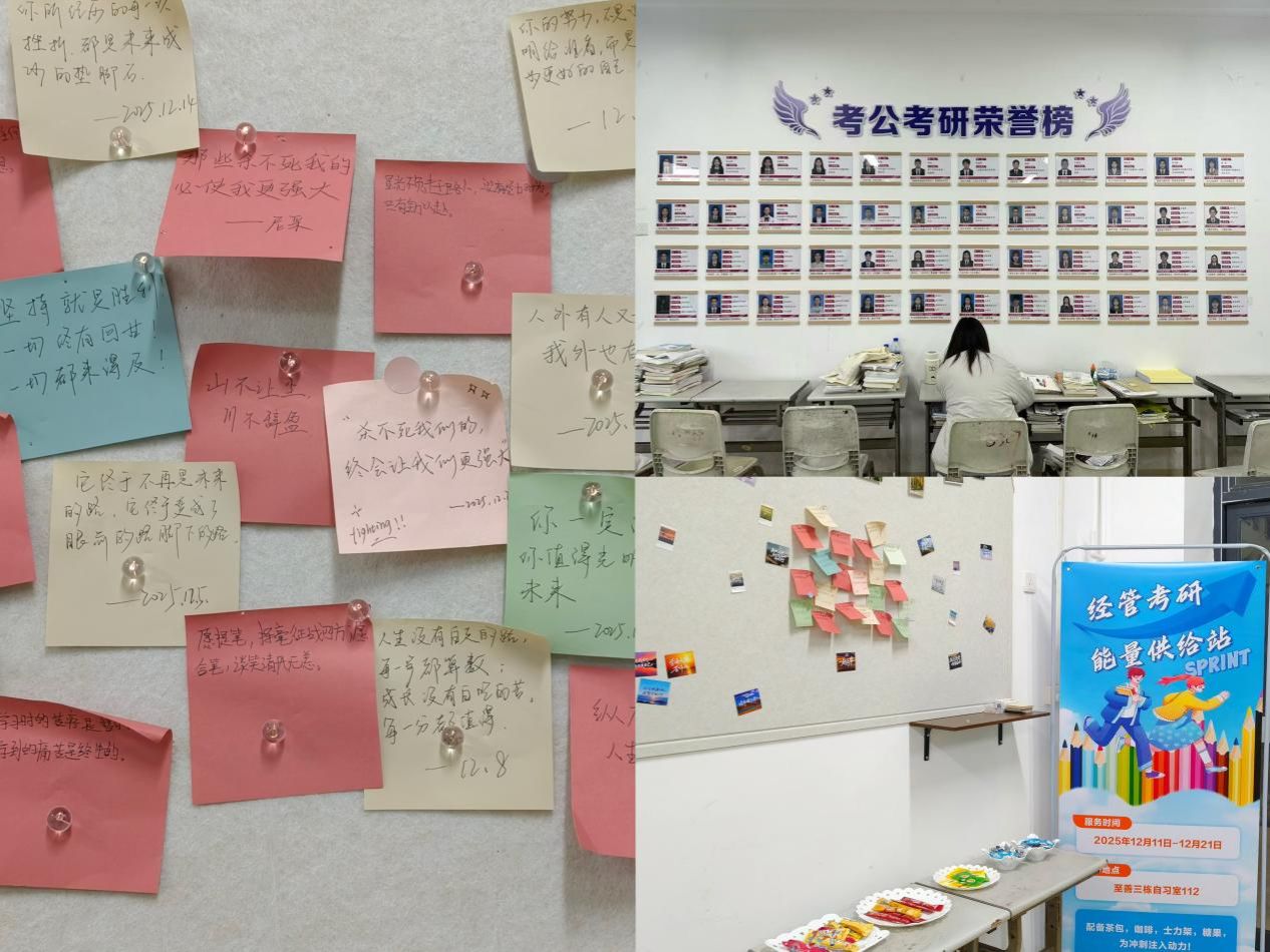 活动现场,重新布置后的经管学院“一站式”学生社区考研自习室同步启用,成为备考学子潜心备战的重要阵地。自习室内专门设立“考研能量供给站”,免费为学子提供咖啡、茶包、糖果等提神补给,帮助大家及时缓解学习疲劳、保持高效备考状态,用心打造有温度、有支撑的备考环境。