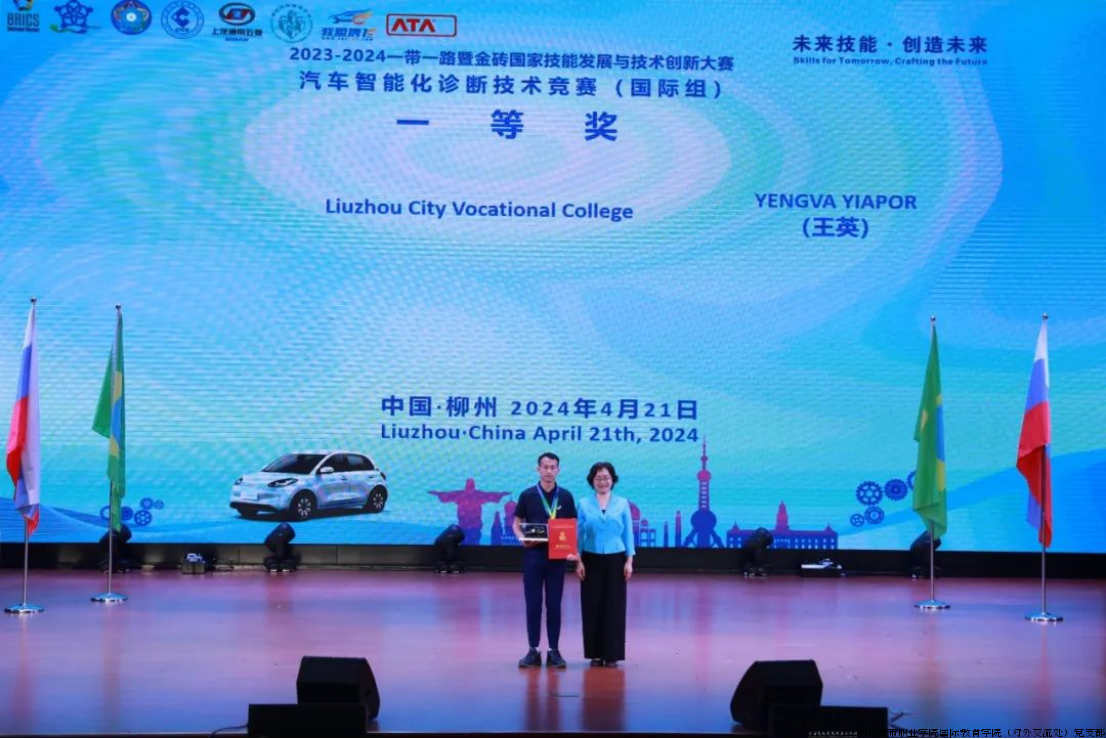 面对语言障碍与专业基础薄弱的双重挑战,这位湄公河畔的学子以"晨起背术语,夜半研电路"的毅力,在学校的"沉浸式培养"模式下,将实训场变成了突破自我的战场。2023-2024一带一路暨金砖国家技能发展与技术创新大赛汽车智能化诊断技术竞赛上,他精准的故障诊断如同外科医生般利落,最终以国际组一等奖的佳绩,站在了最高领奖台。