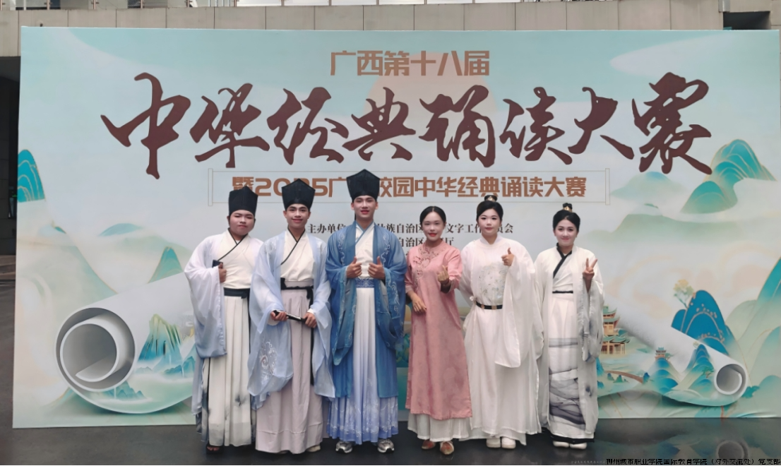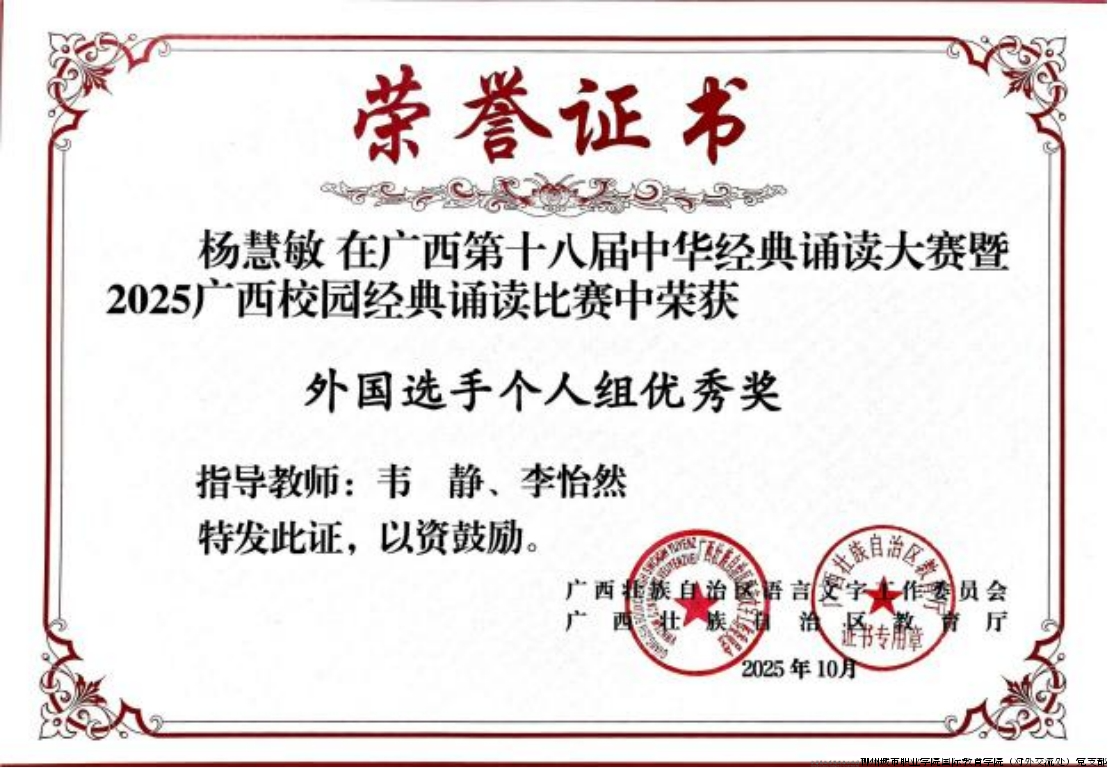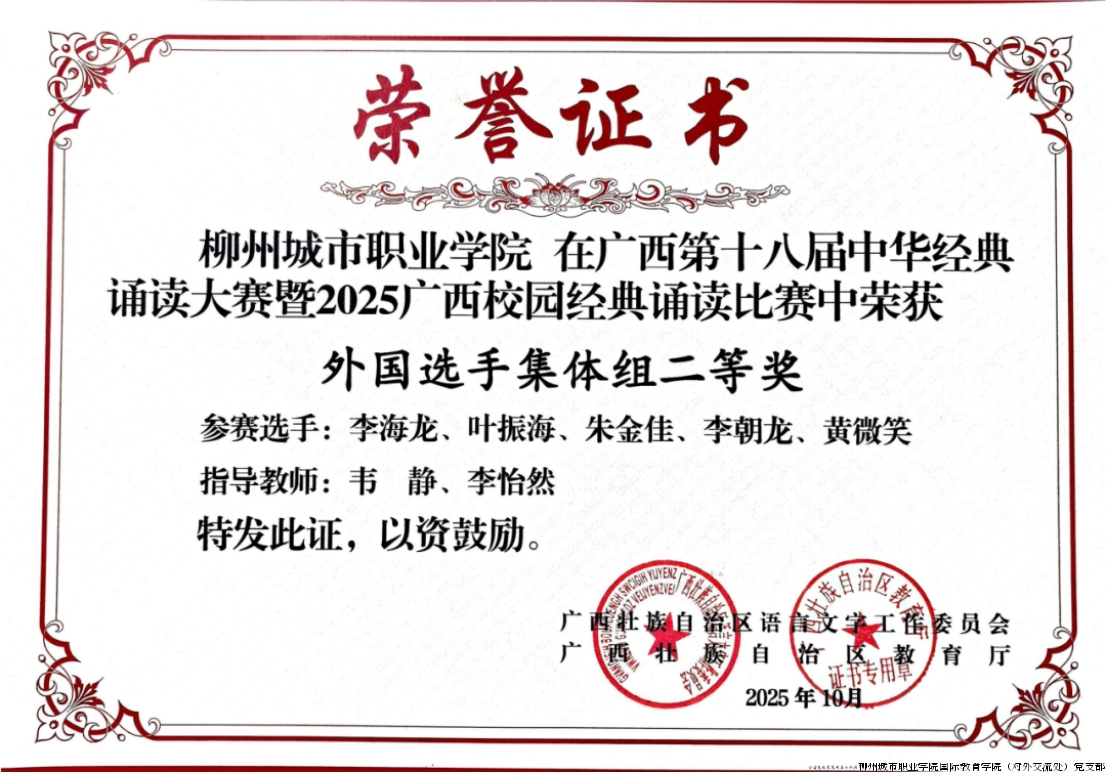 在近日正式公布成绩的广西第十八届中华经典诵读大赛暨2025广西校园中华经典诵读大赛中,柳州城市职业学院国际学生不负众望,斩获外国选手集体组二等奖及外国选手个人组优秀奖,用优异的成绩为这个秋天增添了丰硕的果实,也成为了学校国际化育人实践的生动注脚。