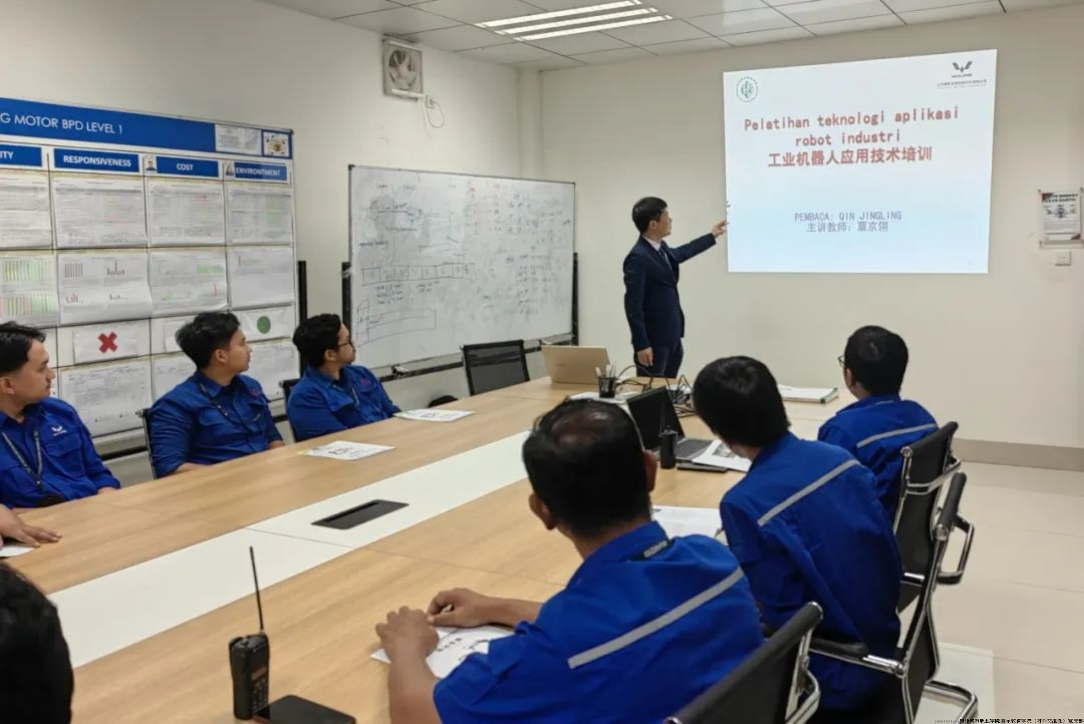 在代表团考察上汽通用五菱印尼汽车有限公司生产基地过程中,覃京翎为总装车间技术人员做了工业机器人应用技术的培训与指导,代表团还与在基地工作的学校印尼籍毕业生校友代表亲切会谈,回忆深厚的师生情谊,勉励同学们继续努力,为中国与印尼的友好事业做出更大贡献。此外,代表团专程拜访了雅加达五菱中心,对接了印尼新能源汽车培训业务,为工匠学院海外技术服务版块做好前期准备。