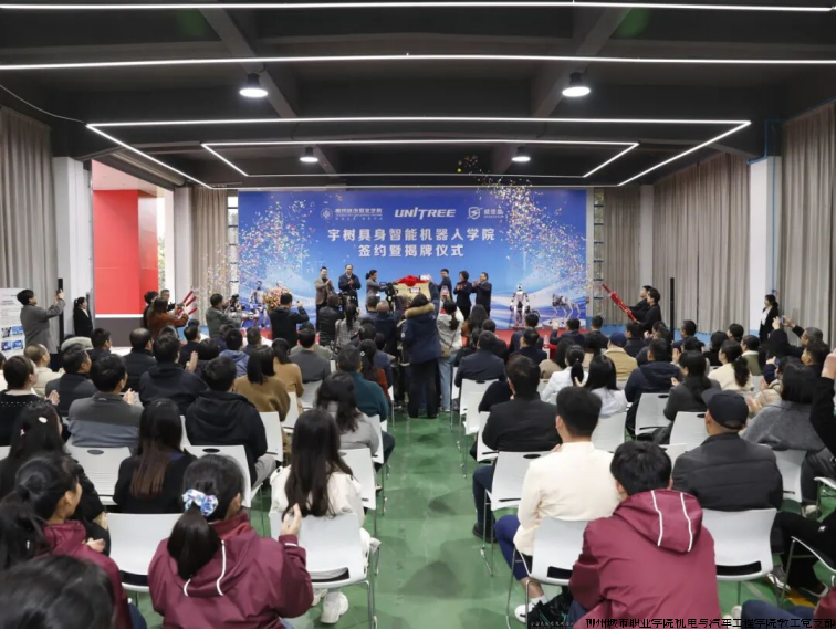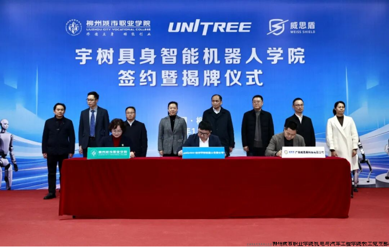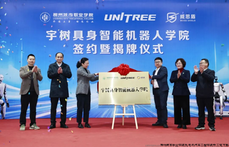 近日,在机电与汽车工程学院教工党支部全程精心筹备和组织下,柳州城市职业学院联合杭州宇树机器人有限公司、广西威思盾科技有限公司三方共建的“宇树具身智能机器人学院”签约暨揭牌仪式在我校举行。据悉,这是宇树公司与高职院校合作成立的国内第一家具身智能机器人学院,开启了宇树科技与柳州在人工智能机器人领域的合作,将成为有力助推柳州打造“西南智谷”“智造名城”的关键举措,为柳州乃至广西人工智能产业高质量发展注入强劲动力,为产教融合、科教融汇写下生动注脚。