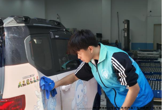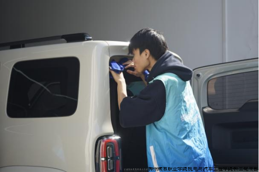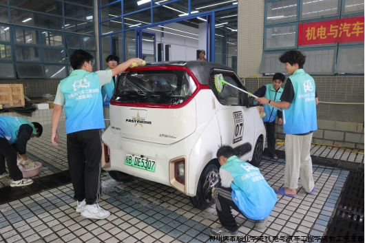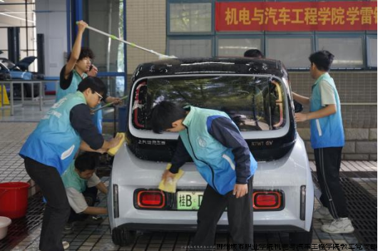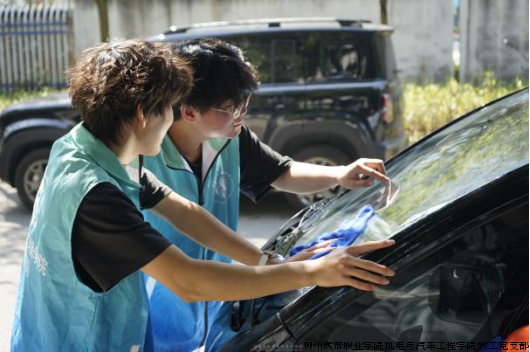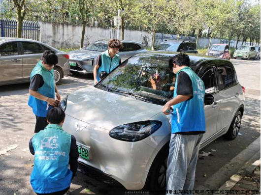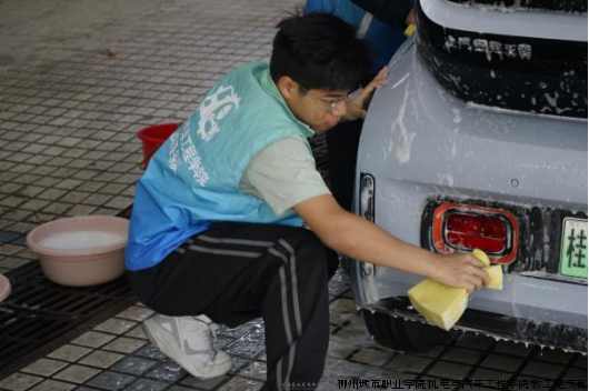 活动期间,志愿服务队的同学们早早来到洗车区,身着统一蓝色工作服,分工有序、热情细致地为前来清洗的车辆提供服务。从喷水、打泡沫到冲洗、擦干,每一个环节都认真操作,充分运用课堂所学的汽车维护相关知识与技能。阳光下,车身上的白色泡沫格外醒目,同学们忙碌的身影与专注的神情,构成了校园里一道温暖而专业的风景线。