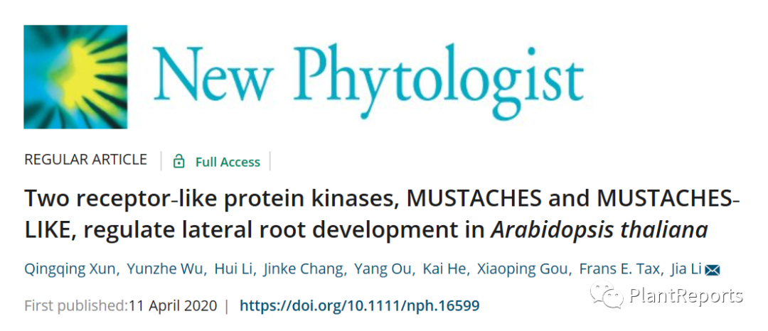 近日,New Phytologist 在线发表了兰州大学黎家教授课题组题为“Two receptor‐like protein kinases, MUSTACHES and MUSTACHES-LIKE, regulate lateral root development in Arabidopsis thaliana”的研究论文。该研究鉴定了两个类受体蛋白激酶,并揭示了生长素信号通过它们调控拟南芥侧根发育的机制。