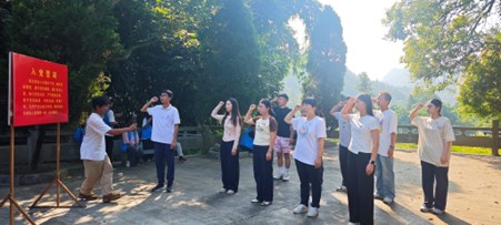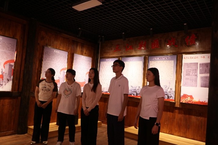 在三江剿匪纪念馆,泛黄的老照片定格着战火硝烟中的坚毅面庞,锈迹斑斑的步枪、煤油灯等实物静静陈列,无声诉说着当年剿匪斗争的艰辛卓绝。战士们在山林间迂回作战、村民们偷偷送粮支援的动人故事历历在目,那些舍生忘死的瞬间让同学们频频驻足沉思。同学们在笔记本上写下感悟,纷纷表示要将这份震撼化为行动,让红色基因融入青春血脉。随后,党员代表来到烈士纪念碑前,重温入党誓词。