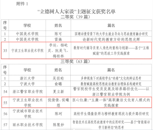 近日,由浙江省高等教育学会思想政治研究分会主办的“立德树人大家谈”主题征文活动评选结果揭晓,我校共选送3篇征文,其中我院倪倩倩、侯曦煜老师撰写的征文《医心红廉:“五廉一体”高职廉洁文化育人模式的实践探索》获三等奖。