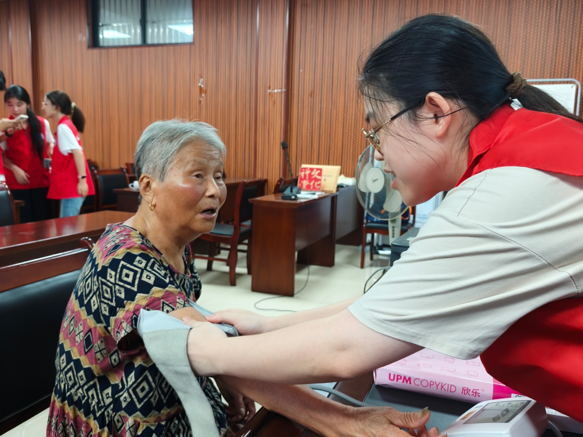图为实践团成员章诗瑜为老人量血压。章之悦 供图