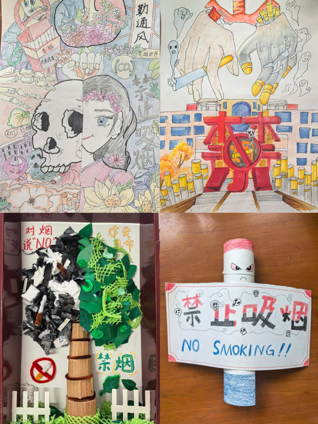 除了常态化的实践行动,“创意设计·指尖创作”环节则为学子们提供了表达禁烟理念的多元平台。活动面向医技学子征集禁烟主题海报与DIY 手工作品,鼓励大家以艺术创作的形式传递 “远离烟草、珍爱健康” 的核心思想。征集通知发出后,学子们踊跃参与,充分发挥想象力与创造力,将禁烟主题与艺术表达深度融合。海报作品中,有的通过强烈的色彩对比展现吸烟的危害,有的以温情的画面传递健康生活的美好;DIY 手工作品则创意十足,有用废旧烟盒改造的环保摆件,有用布料、麻绳制作的禁烟标语挂饰。每一件作品都饱含着学子们对无烟校园的向往,通过具象化的艺术语言,让禁烟理念更具感染力与传播力。目前,活动已收到各类创意作品80余件,学院将对优秀作品进行集中展览,进一步扩大禁烟宣传的覆盖面与影响力。