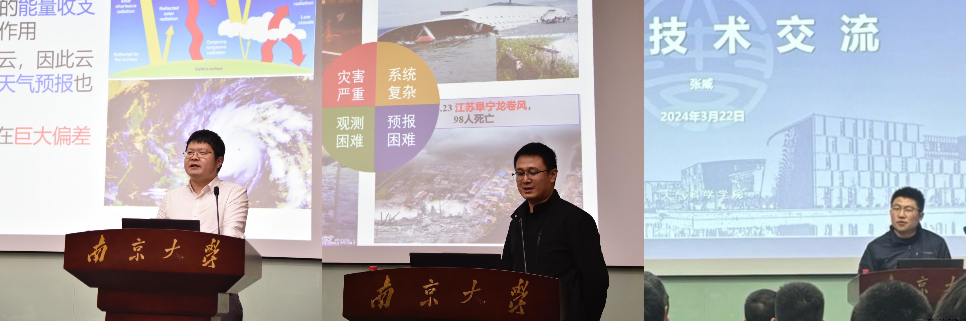 交流会上,大气科学学院教师带来了精彩的报告。周晨教授围绕云的卫星遥感和激光雷达遥感的主题,介绍了对云的观测技术的发展,从最初的目测、飞机探测到现在多种波段遥感都进行了详细的讲解。黄浩助理教授介绍了雷达探测技术和应用,对比了不同天气雷达探测方式的差异,并对探测原理和方法进行了细致讲解。张威工程师结合自身在业务单位工作的经验,向大家讲解了最新的预报模型和预报技术。