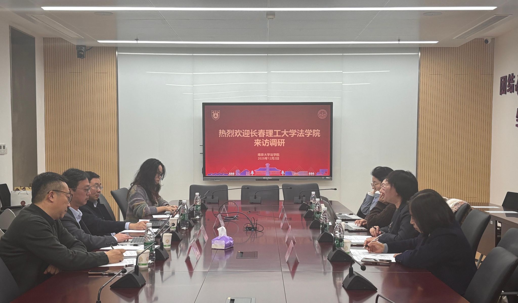 2025年12月2日,长春理工大学法学院副院长齐秀梅带领调研团赴南京大学法学院访问交流。南京大学法学院副院长刘勇、副院长陈坤、院长助理姜冲、党委组织员周恋恋参与交流。本次会议在南京大学法学院西南楼举行。双方围绕法学专业本科生和研究生培养方案的制定、课程体系设置与特色实践经验教学、涉外法治人才培养的优秀经验做法等议题展开深入研讨。