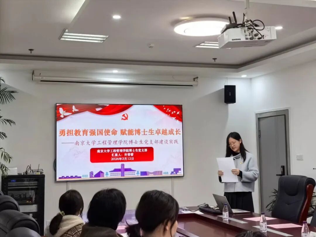 随后,南京大学工程管理学院博士生党支部副书记兼组织委员许菁蕾作党建特色工作分享,展示了支部作为第三批全国高校“百个研究生样板党支部”,在党建工作创新、学术科研引领、思政育人实效等方面的探索成果与实践经验。