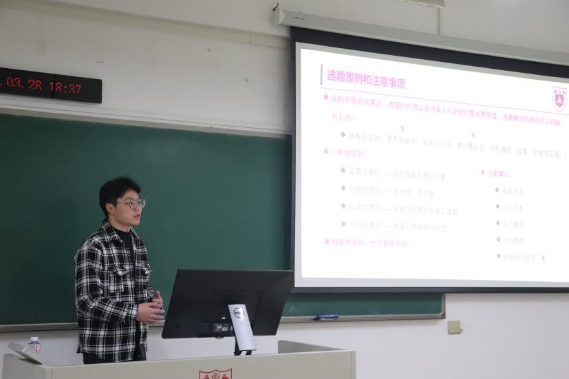 刘龙均学长围绕选题的重要性、选题原则和注意事项、如何选题这三个方面展开了深入讲述。刘龙均学长指出,选题是研究的起点和基础,很大程度上决定了研究成果的价值。从科学研究的意义、选题的作用以及评审人对研究的要求等角度出发,学长将选题的原则归纳为以下五点:现实性、创新性、有条件完成、有兴趣完成、材料基础(成果、文献或实践)。针对大家最为关注的“如何选题”这一核心问题,刘龙均学长分享,选题应该采用前瞻式与回顾式相结合的策略,能够为选题工作提高有效指引。