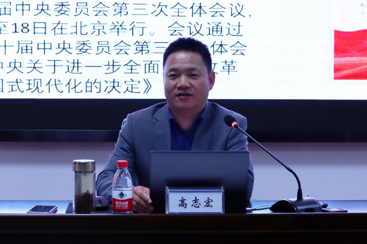 高志宏以《党的二十届三中全会精神解读》为题,从回顾党史上的三中全会引入,紧扣党的二十届三中全会精神,围绕习近平总书记在党的二十届三中全会上的重要讲话和《中共中央关于进一步全面深化改革、推进中国式现代化的决定》主要内容,提出“为什么改”“改什么”“怎么改”,对全会精神进行了全面宣讲和深入解读。从回顾党史上的三中全会引入,对党的二十届三中全会精神的基本情况、重要意义和核心内容作了系统的阐述。他指出,党的二十届三中全会审议通过的《中共中央关于进一步全面深化改革、推进中国式现代化的决定》是指导新征程上进一步全面深化改革的纲领性文件。随后,他从《决定》提出300多项重要改革措施、进一步全面深化改革贯彻六条原则等方面对《决定》进行了深入的讲解,并围绕“为什么改?改什么?怎么改?”的问题,通过丰富的数据和案例向大家作了生动解读。对于全会精神在学校、学院的贯彻落实,他强调,改革的成功并非易事,要以功成不必在我的精神境界和功成必定有我的历史担当,一张蓝图绘到底,一茬接着一茬干,求真务实,真抓实干,做到“抓铁有痕”“踏石有印”,以实绩实效和师生满意度检验改革。