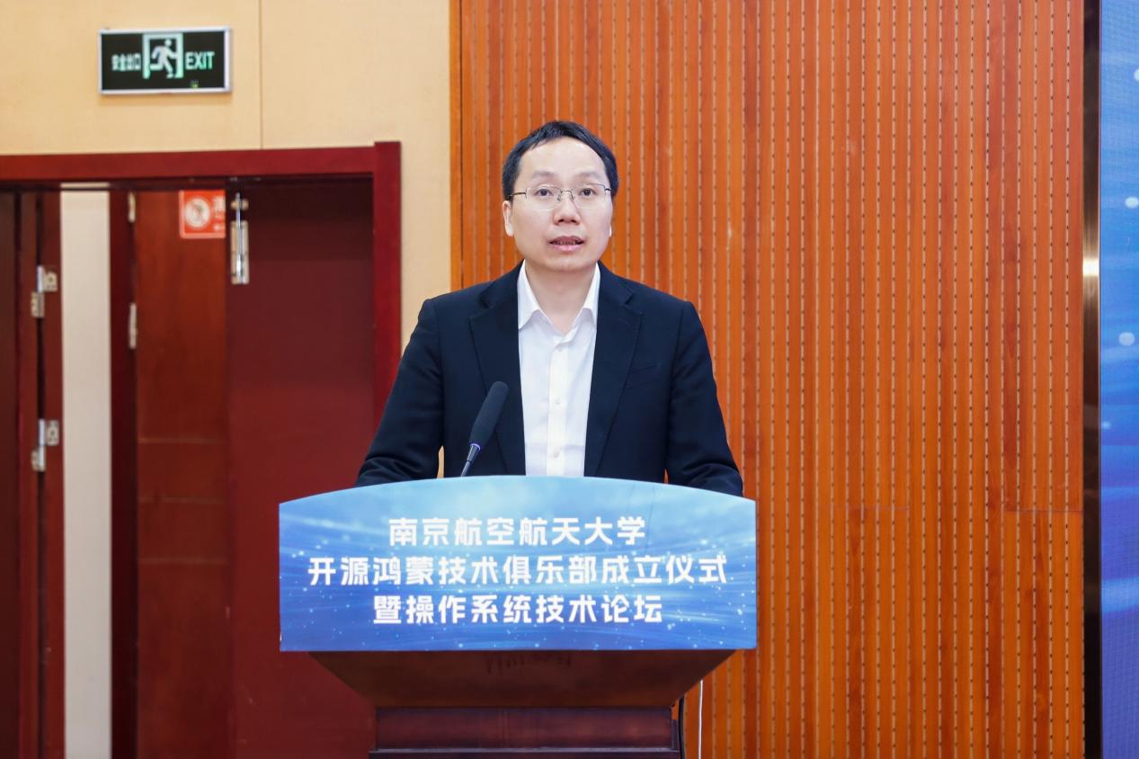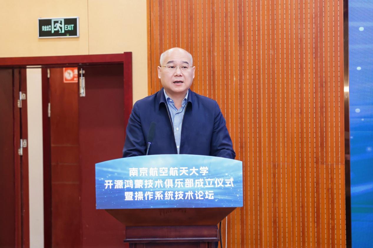 黄志球代表学校致欢迎辞。他表示,作为以航空航天为特色的高校,南京航空航天大学始终以“自主可控、科技自立”为导向,依托国家特色化示范性软件学院建设,在基础软件、嵌入式软件、智能装备等领域深耕多年。开源鸿蒙“万物智联、软硬协同”的技术特性与该校航空航天智能系统、装备研发等领域的探索高度契合,俱乐部的成立既是校地校企合作的新成果,更是学校深耕基础软件人才培养、推动科研成果落地的新起点,将为学子搭建“课堂学习+产业实践”的衔接桥梁,助力开源鸿蒙在航空航天特色场景拓展应用边界。