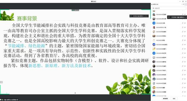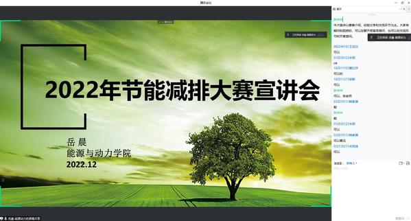 岳晨从竞赛背景、时间安排、竞赛流程等多个方面向同学们全方位介绍节能减排大赛,鼓励同学们结合身边事和现有研究项目入手,主动寻求老师们的专业指导,组建团队,创造性地开展研究。