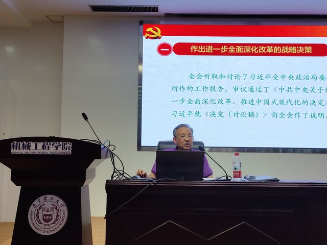孟天财在党课中讲到,全会进一步明确指导思想和行动路线、进一步全面深化改革的总目标,重点围绕 “高质量发展是全面建设社会主义现代化国家的首要任务”“教育、科技、人才是中国式现代化的基础性、战略性支撑”等重要论断、观点展开阐述。他强调,广大师生党员要深入学习领会全会精神,原原本本通读全文,在理解精神的基础上明确未来奋斗目标,落实到行动上,认真学习、练好本领、潜心研究、创新争先,勇担强国使命,为推动国防和军队现代化、中国式现代化贡献青春力量。
