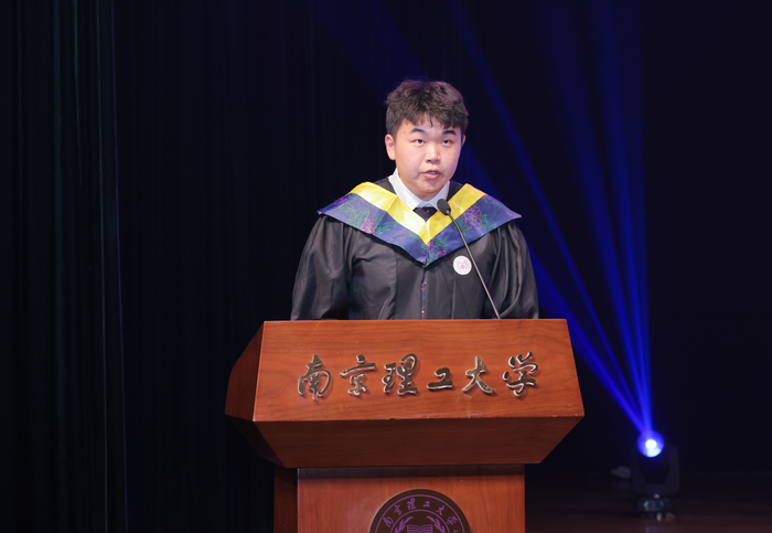 第四篇章“校友力量·薪火相传”,大会播放了校友寄语视频。学院党委书记、校友会会长吴志林教授宣读校友联络人名单,并为校友联络人颁发聘书及赠送毕业纪念品。2021级学生于松硕作为毕业生代表发言,表达对母校的深厚感情以及对未来勇担使命的坚定决心。随后,他带领2021级全体本科毕业生宣誓,铭记南京理工大学“团结、献身、求是、创新”的校风,秉持机械工程学院“唯实、献身”的院训,赓续军工志,勇担强国梦,为实现中华民族伟大复兴而努力奋斗。