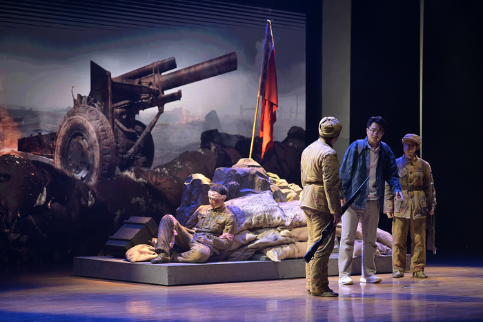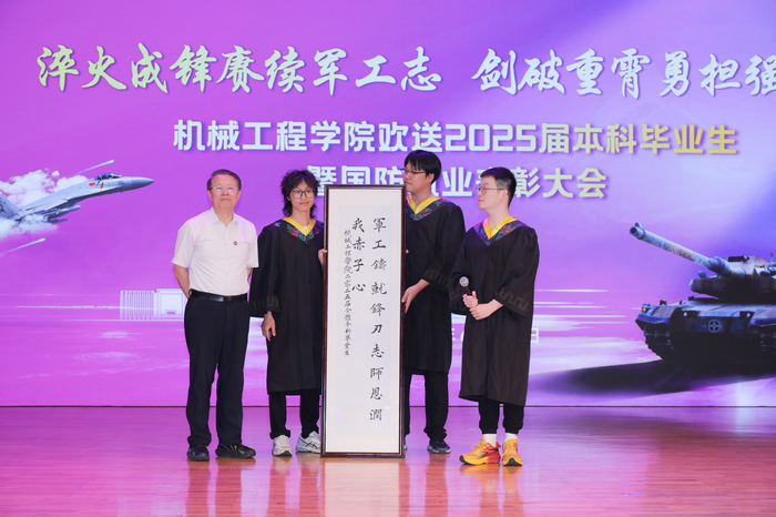第三篇章“逐梦启航·感恩有你”,大会播放了来自师长、家长等的寄语视频,真挚的话语饱含着对毕业生们的殷切期望与美好祝福。毕业生代表为各专业方向学生推荐的“最受欢迎的教师”献花,表达对老师们的感激与敬意。2021级学生代表汪吴乙向学院赠送书法作品《军工铸就锋刃志,师恩润我赤子心》,以此铭记学院的培育之恩。学院话剧团编导的舞台剧《号声嘹亮》,以跨越时空的剧情演绎,使参会人员感受到75年前中国人民志愿军的热血与担当。