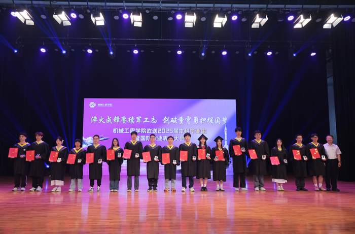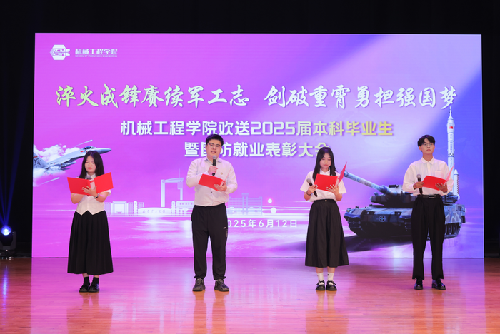 6月12日下午,机械工程学院欢送2025届本科毕业生暨国防类就业表彰大会在学校学术交流中心观众厅举行,大会的主题是“淬火成锋赓续军工志,剑破重霄勇担强国梦”。机械工程学院党委书记吴志林,院长陈龙淼,学院党委副书记、纪委书记陈荣明,学院副院长宋德锋、郭锐、朱志伟,学院各系部支部书记、系主任、教师代表、全体辅导员和全体本科毕业生参加了本次大会。