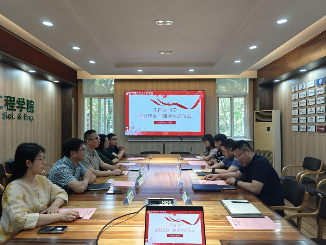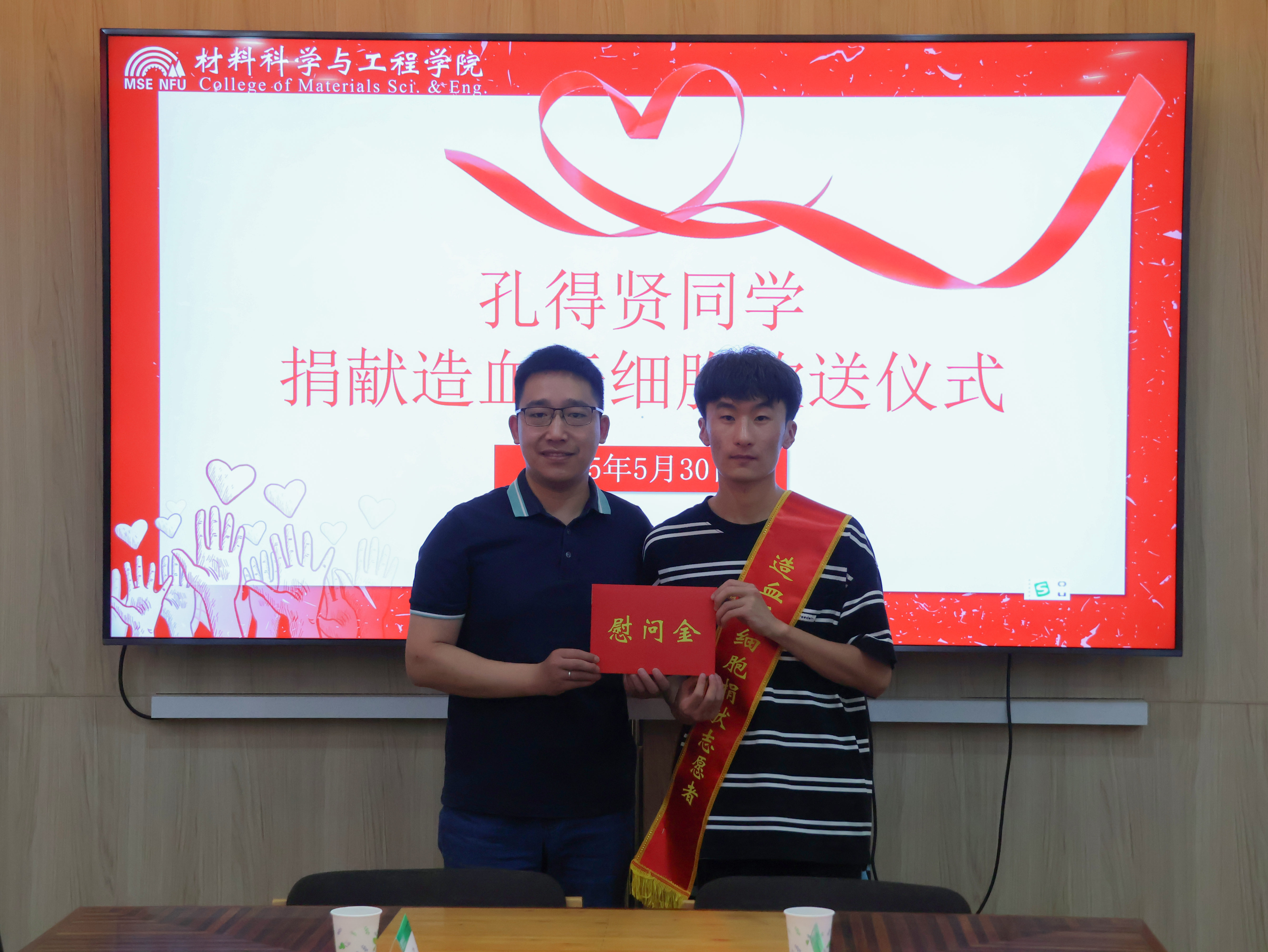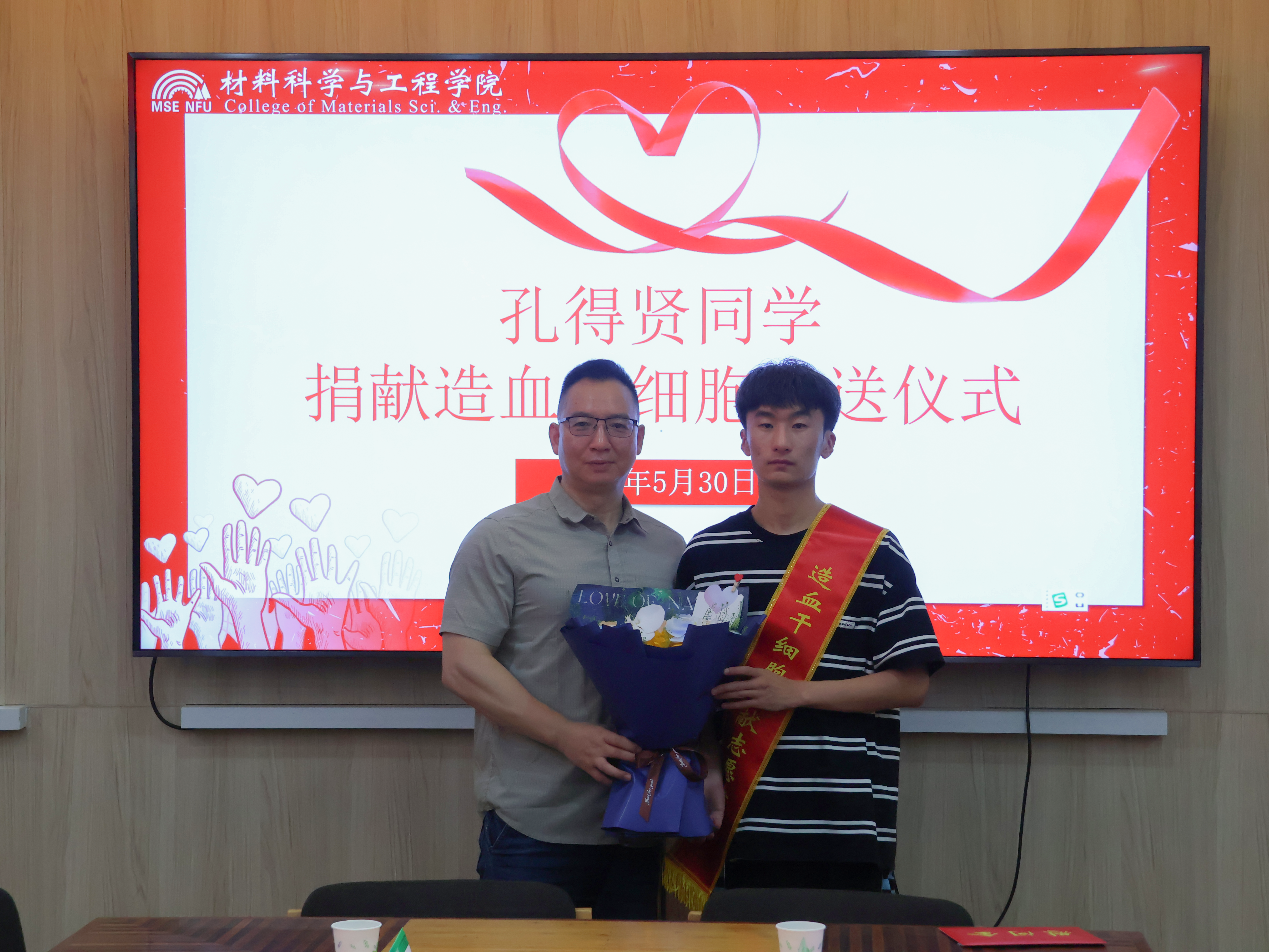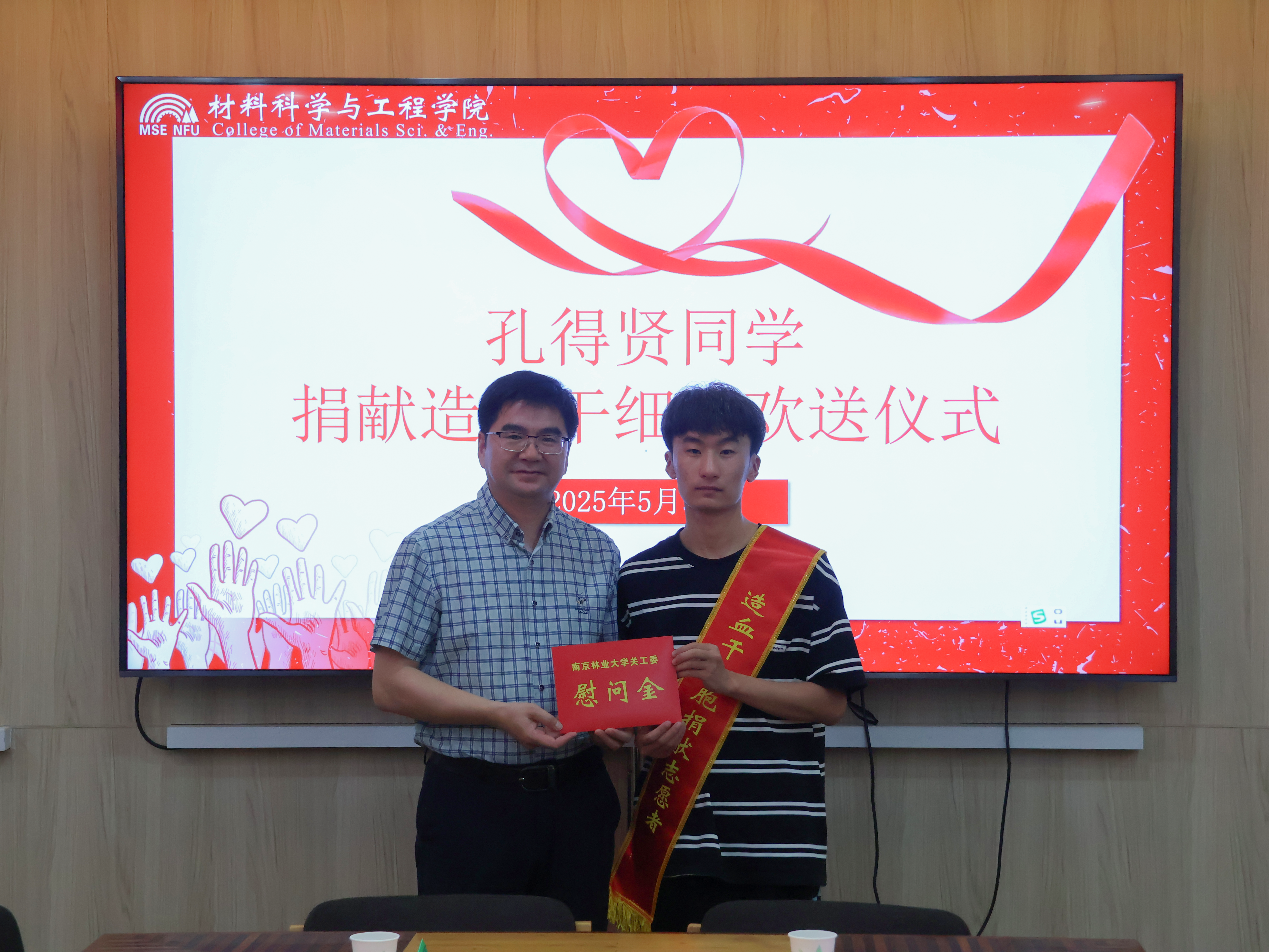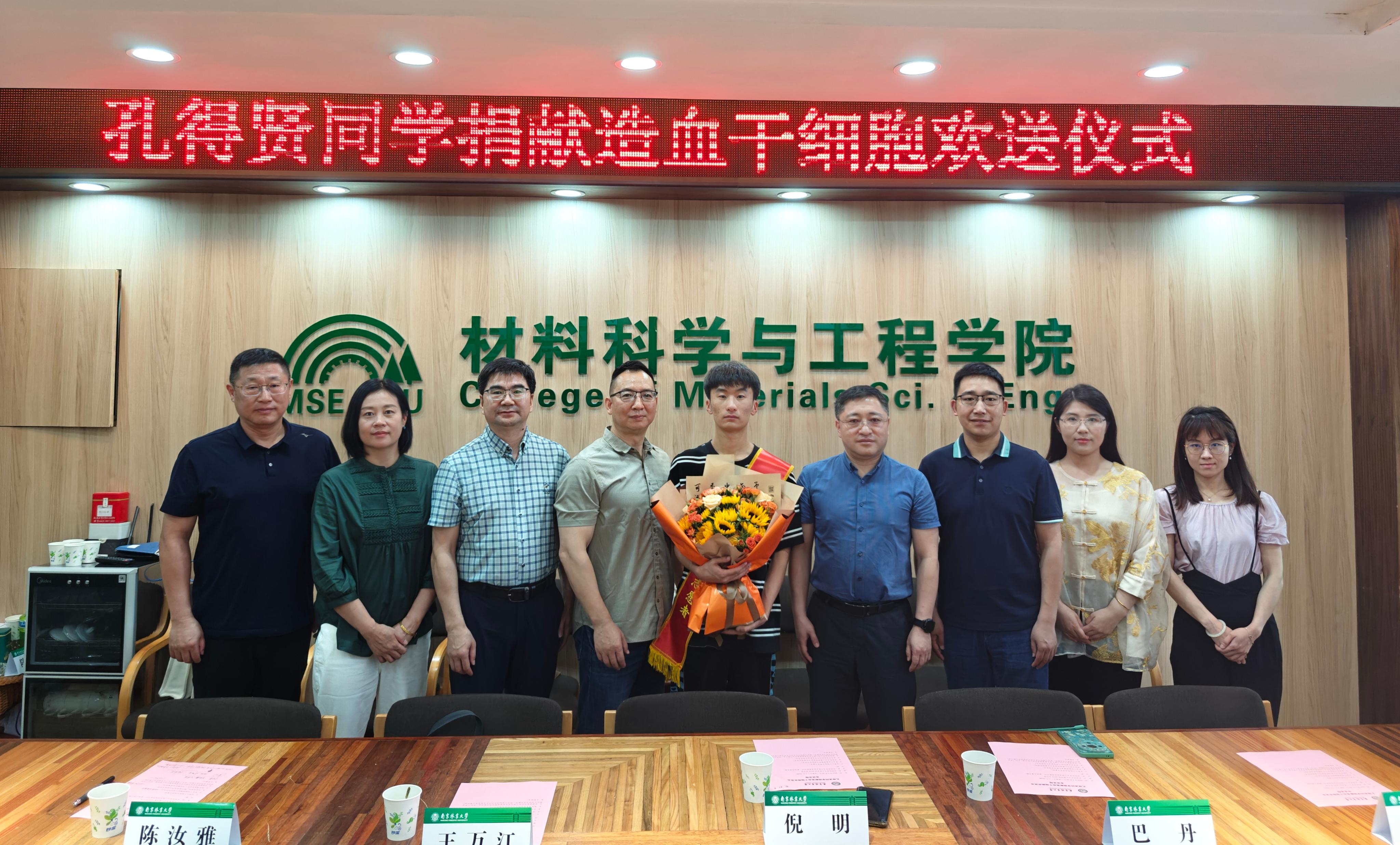 大爱无疆施德泽,生命接力暖人间。5月30日上午,我院在4210会议室举行孔得贤同学捐献造血干细胞欢送会。南京市玄武区红十字会副会长倪明、三级主任科员巴丹,南京林业大学离退休处党委书记兼校关工委秘书长王万江,南京林业大学团委挂职副书记宋飞、实践部部长陈汝雅,材料学院党委书记孟国忠,党委副书记、副院长蔡志敏,辅导员檀芬、杨泽宇共同见证这场温暖的生命之约。会议由蔡志敏副书记主持。