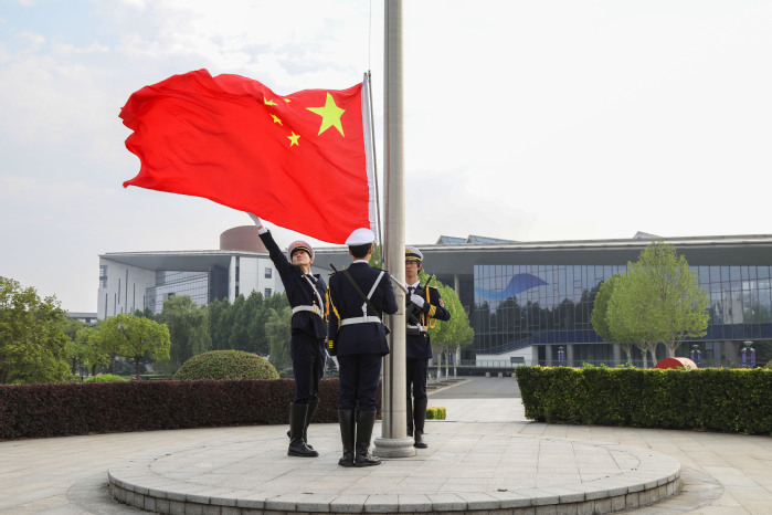 在国歌声中五星红旗冉冉升起,全体师生行注目礼。