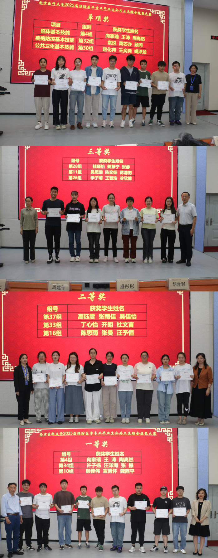 本次大赛参照执医考试模式,由学院联合江苏省疾病预防控制中心及第一附属医院专家共同组成组委会,设置临床基本技能、疾病防控基本技能和公共卫生基本技能三个考站,以公共卫生综合案例和技能操作的形式综合考核学生的预防医学技能。参赛学生三人为一支参赛队,分为A、B、C角色,依次合作完成各考站比赛任务。经过一天的激烈角逐,大赛圆满闭幕。评选出一等奖3项、二等奖7项、三等奖10项、考站单项奖3项。