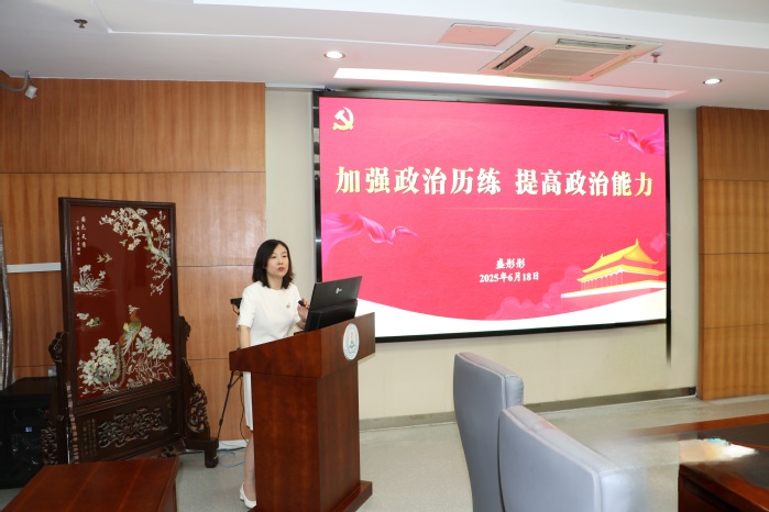 首先,学院党委盛彤彤书记以《加强政治历练 提高政治能力》为题作专题党课,重点就领导干部政治能力建设的背景意义和总书记关于政治能力建设的重要观点进行了分享。她指出,领导干部提高政治能力,最重要的是:找准本领域工作的历史方位,把本职工作放在事业全局中来思考,把具体问题提到政治高度来把握,把当前任务放在过程链条中来运筹,做到因时施策、因时而为。她鼓励大家在敬业奉献中锤炼政治品格,为学院高质量发展做出更大贡献。