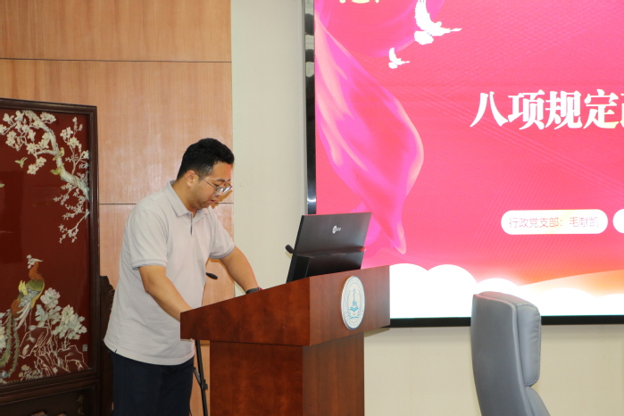 接着,行政党支部书记毛献凯老师以《八项规定深刻改变中国》做了专题党课,汇报了学习心得体悟。他倡议大家坚持问题导向,推动深入贯彻中央八项规定精神学习教育向纵深开展,学在深处、查在细处、改在实处。以踏踏实实的工作态度推进学习教育取得实效。