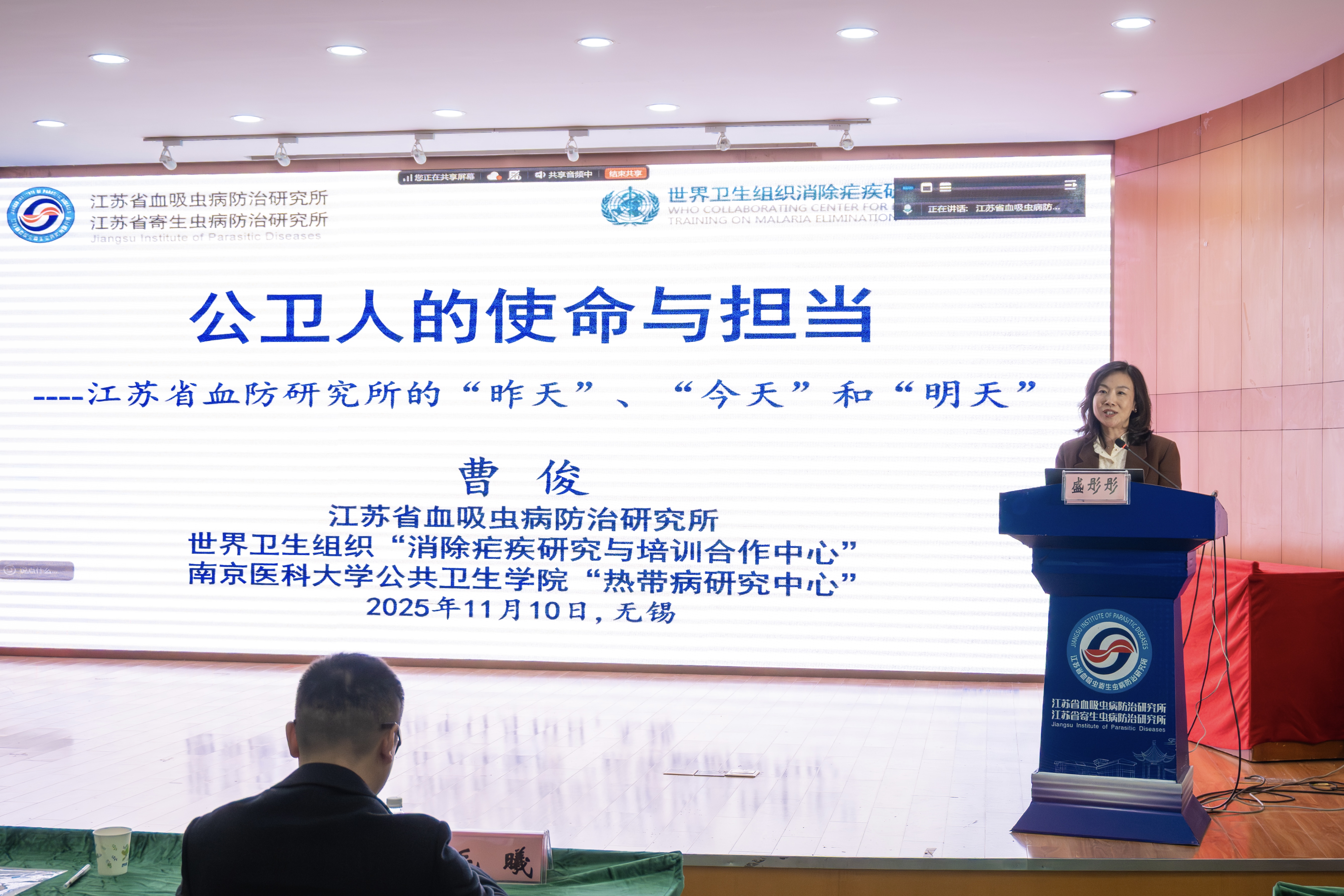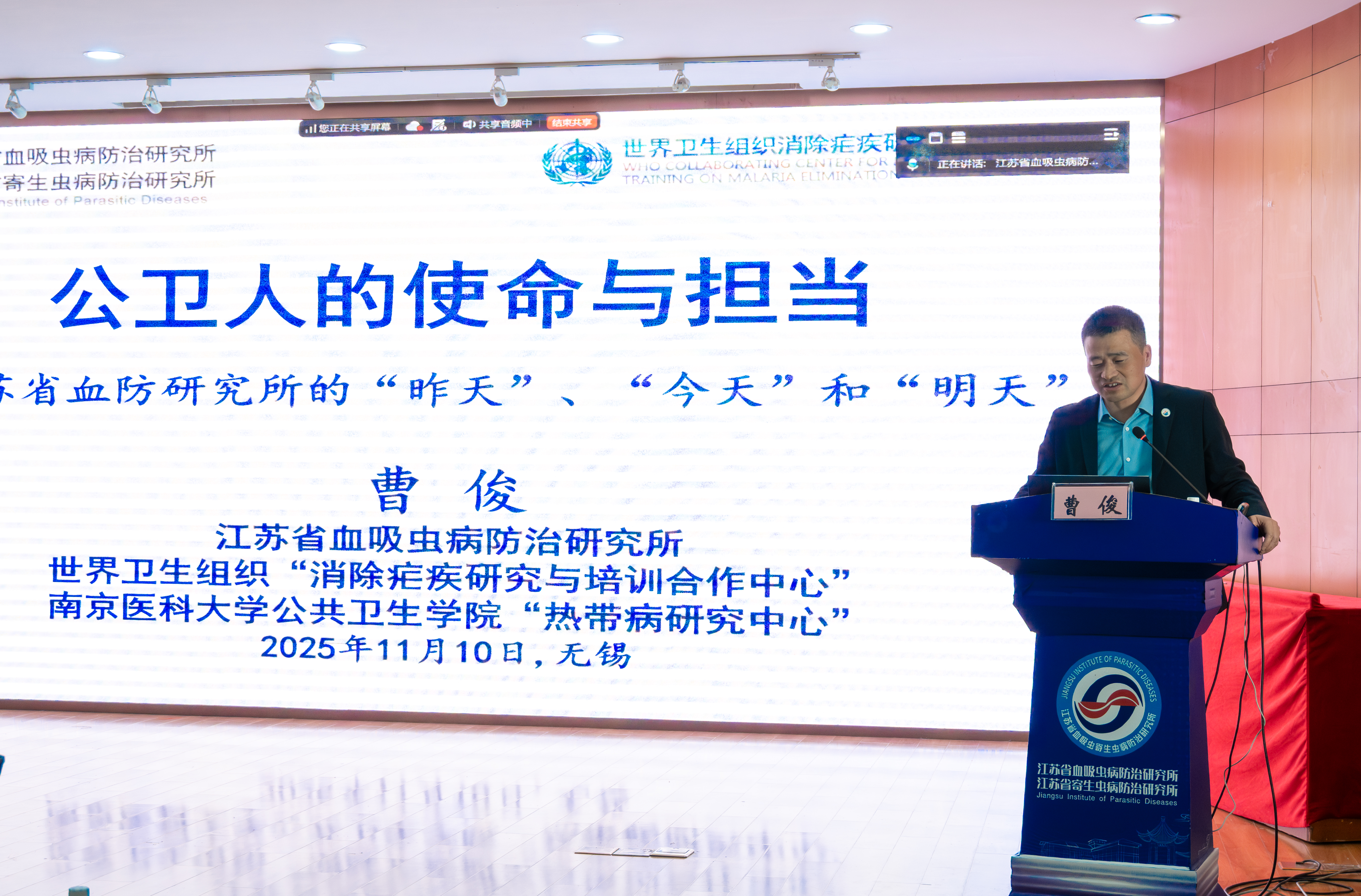 曹俊所长以江苏省血吸虫病防治研究所的“昨天、今天、明天”为主线,深情讲述了建所初期以肖荣炜、叶嘉馥为代表的老一辈专家学者白手起家、扎根一线的感人事迹。随后,他介绍了江苏省血吸虫病防治研究所在疾病防控“走在前列”、科学研究“争做示范”、国际合作“争当表率”的生动实践。特别是深度参与“一带一路”卫生合作,积极支持非洲疾控体系建设,中国公卫人正以坚实行动践行“人类卫生健康共同体”理念,把责任担当书写于全球公共卫生治理的舞台,奋力开创以中国智慧赋能全球健康的新篇章。