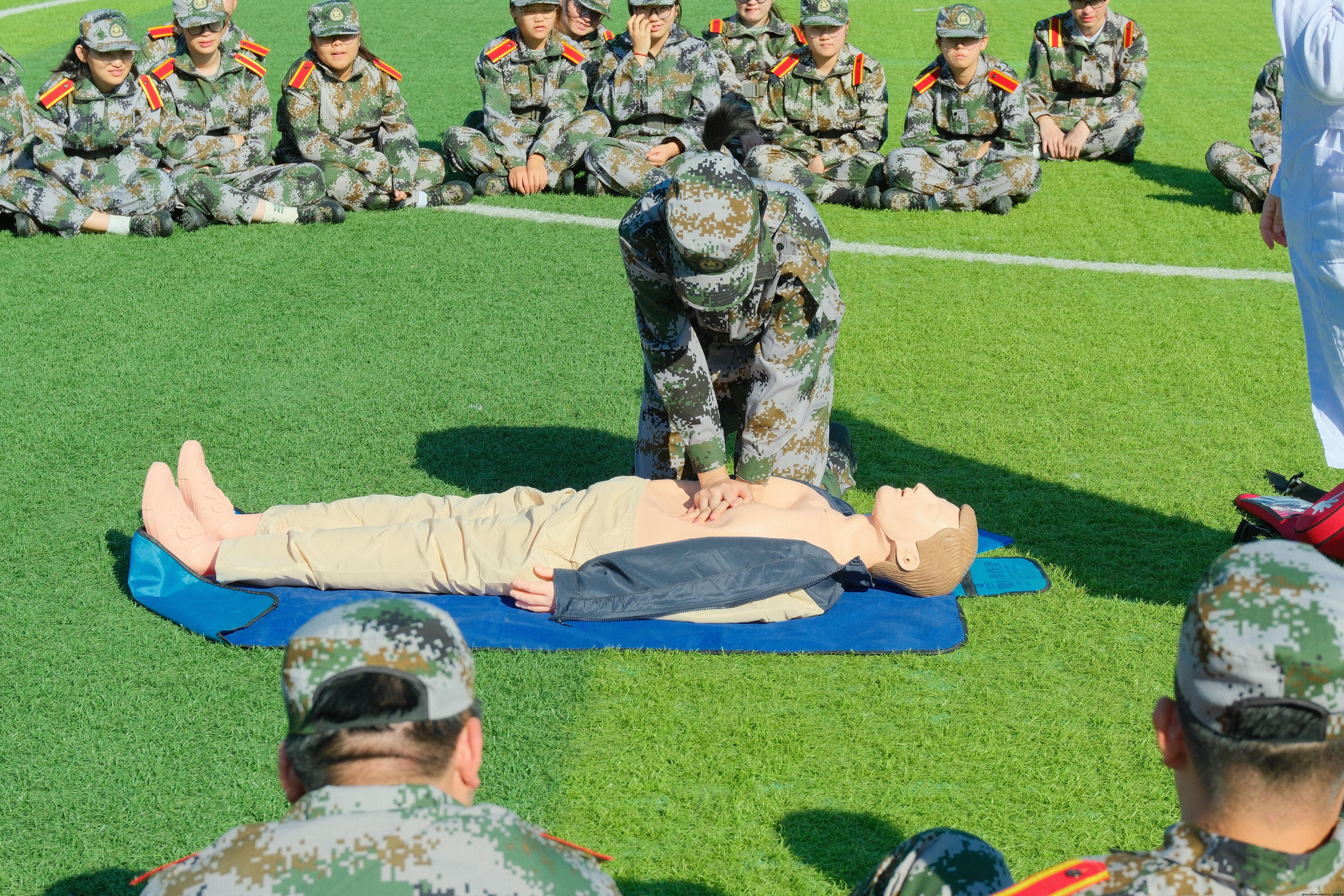 连云港市急救中心、连云港市海州区红十字会、中国人民解放军94575部队及学院护理学部、临床医学部的老师和教官参与教学培训,此次培训包括理论讲解和技能演练,并融合了军训战地救护元素。培训现场,连云港市急救中心副主任顾迎东用理论讲解、示范演练和实操练习的方式,系统全面的讲述了心肺复苏(CPR)和海姆立克急救法的正确操作流程。教官们融合讲解战地救护即止血包扎技术、骨折固定与搬运技术等急救方法,并详细演示各环节操作。同学们在老师和教官的指导下分组练习,认真操作,大家挥汗如雨、井然有序、沉浸其中,在学习和训练中提高急救意识、掌握常见的急救知识和技能。