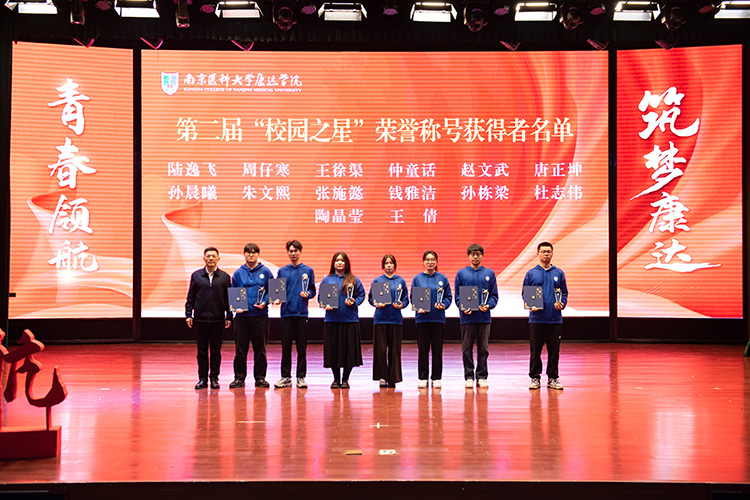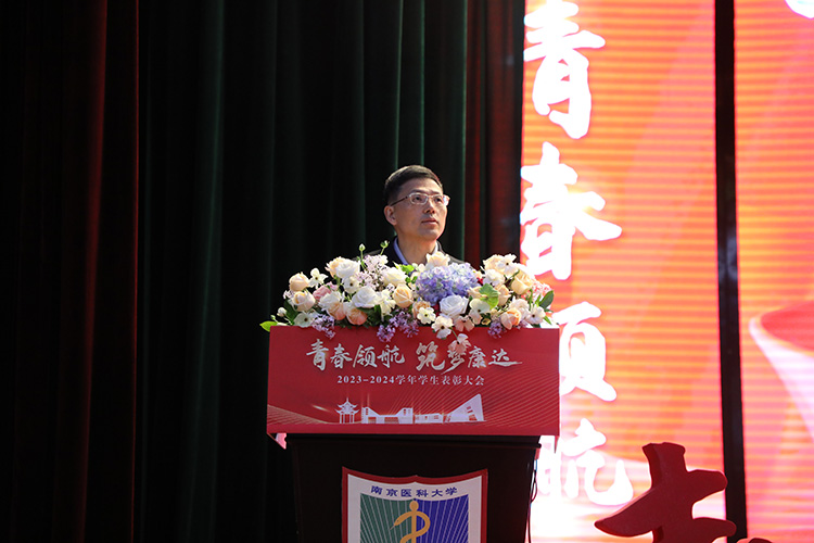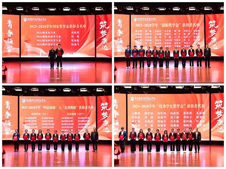 学院党委副书记、副院长王磊,纪委书记顾模进,副院长张怀平,教务处处长何淑通分别宣读了相关表彰决定,与会领导为先进集体和获奖学生代表颁发荣誉证书。刘一麟奖学金获得者2023级急诊1班袁鑫楠、优秀学生干部获得者2022级卫管1班陈安琪、江苏省先进班集体获得者2022级临床5班薛涵分别代表获奖集体和个人发言。
