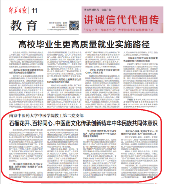近日,《新华日报》第11版以《石榴花开、百籽同心,中医药文化传承创新铸牢中华民族共同体意识》为题报道了我院教工第二党支部依托国家社会科学基金重大项目“敦煌西域出土汉文医药文献综合研究”人才团队,深入领会习近平总书记在文化传承发展座谈会和在敦煌研究院座谈会重要讲话精神,紧扣党的民族工作主线,深入践行铸牢中华民族共同体意识教育实践工作。支部始终坚持以文载道、以文传声、以文化人,围绕“三强化、三坚持、六锻造”,形成以“新时代‘敦煌医学’研究新高地”构筑“铸牢中华民族共同体意识新阵地”的党建工作体制机制。