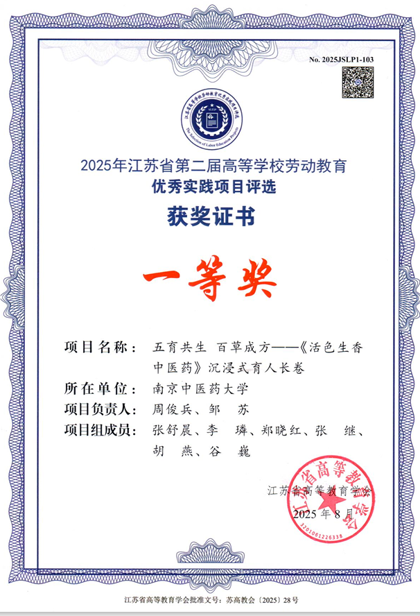 在2025年江苏省第二届高等学校劳动教育优秀实践项目评选中,教工第二党支部周俊兵副教授与马克思主义・医学人文学院邹苏副教授领衔的团队,凭借《五育共生百草成方——〈活色生香中医药〉沉浸式育人长卷》项目,从全省众多申报项目中脱颖而出,荣获一等奖。这份荣誉不仅是对项目创新性与实效性的高度认可,更彰显了团队教师“以劳育人、以德育心”的深厚师德。
