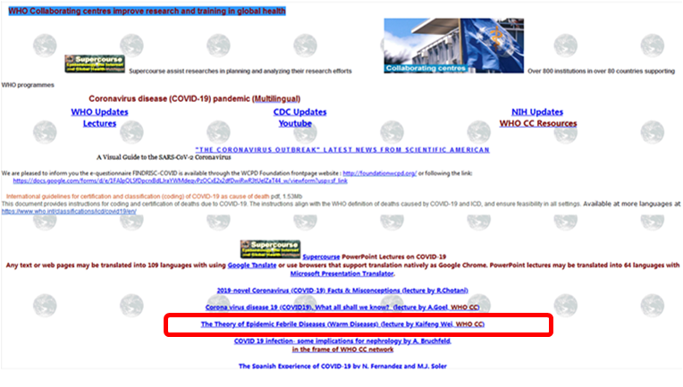 7月8日,我院魏凯峰副教授团队《温病理论与抗疫案例》全英文课件在匹兹堡大学Supercourse网站COVID-19专栏发布。通过国际知名的公共卫生与流行病学领域网络学术交流平台,向世界各国专家学者分享中医温病学科抗击新冠肺炎疫情的学术进展与经验,既展现了中医药在全球医疗卫生体系建设中的责任担当,也是学校作为WHO传统医学合作中心积极推进人类卫生健康共同体建设的积极尝试。