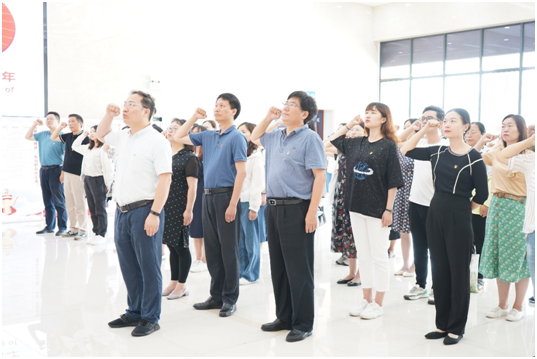 在馆厅前,全体党员面向鲜红的党旗,庄严地举起右手,一起重温了入党誓词。