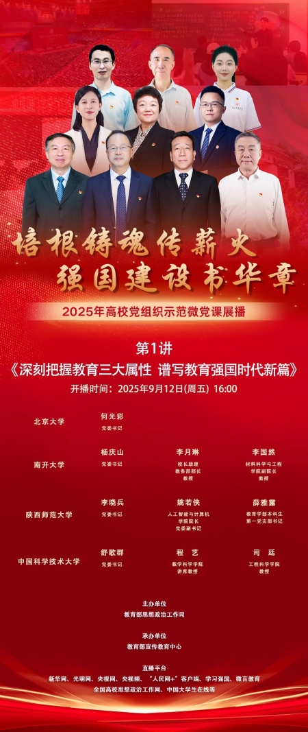 培根铸魂传薪火,强国建设书华章,9月12日下午4点,2025年高校党组织示范微党课展播第1讲《深刻把握教育三大属性 谱写教育强国时代新篇》通过新华网、光明网、央视网、央视频、“人民网+”客户端、学习强国、微言教育、全国高校思政网、中国大学生在线等多个平台面向全国同步播出。