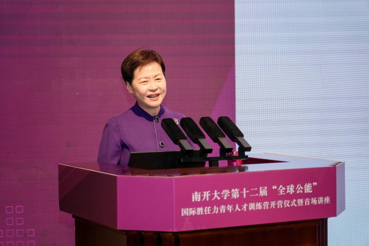 10月10日,南开大学第十二届“全球公能”国际胜任力青年人才训练营开营仪式在八里台校区省身楼举行。香港特别行政区第五任行政长官林郑月娥女士应邀出席仪式,并作训练营首场讲座。南开大学校长陈雨露出席仪式并致辞。中国科学院院士、南开大学副校长陈军主持仪式。