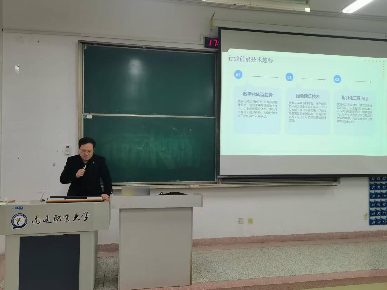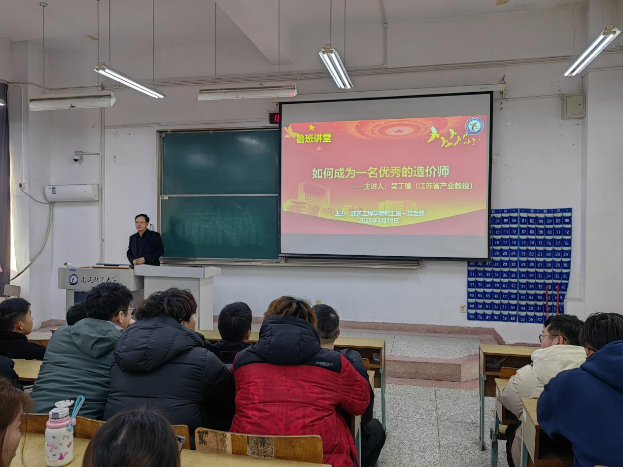 2025年3月19日下午,建筑工程学院党总支教工第一党支部于主教学楼215举办了以“如何成为一名优秀的造价师”为主题的鲁班讲堂,这次鲁班讲堂是教工第一党支部“联学联建促发展 产教融合育匠才”党日活动的一个部分。讲座邀请了江苏省产业教授吴丁建主讲,教工第一党支部书记朱燕主持。本次鲁班讲堂是一次专业讲座,旨在帮助学院学生深入了解造价师职业,明晰职业发展路径,提升专业素养。