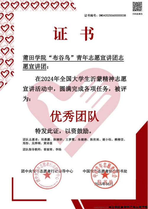 图为莆田学院“布谷鸟”青年志愿宣讲团荣获全国优秀团队证书。