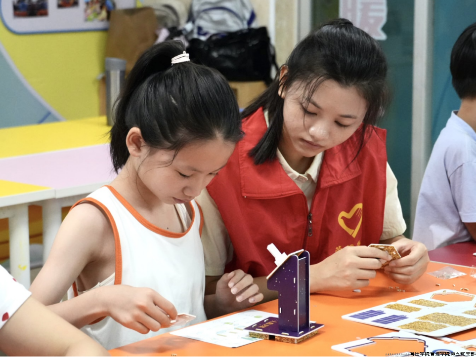 图为小朋友们在志愿者的指导下拼装航天模型。