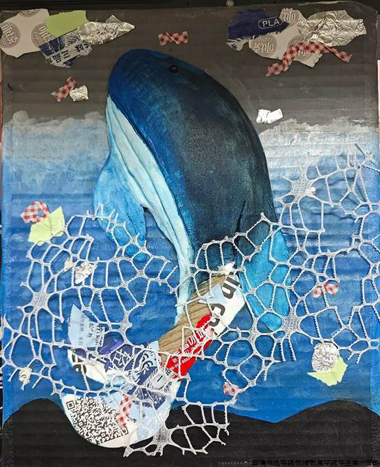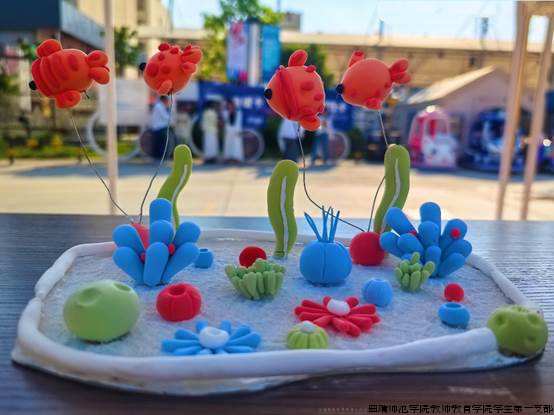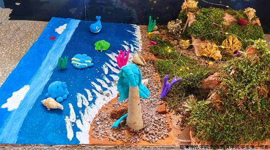 活动现场化身海洋主题艺术工坊,学生们巧妙运用超轻黏土、废旧材料、综合绘画等媒介,构建起立体化创作矩阵。作品《蔚蓝囚歌》以蓝鲸象征纯净海洋,撕裂的渔网暗喻人类对自然的禁锢,呼应生态困境中的无声呐喊;作品《指尖鲸语》以卡通风格描绘海底世界,粉色水母、灰色海龟与彩色珊瑚构成灵动生态画卷,呼吁海洋生态的和谐与活力;作品《豚影流光》通过红蟹、紫海葵等造型展现生物多样性,蓝色背景模拟海浪纹理,凸显手工温度;场景作品《珊瑚星海》以动态光影与生物呼应海洋律动,赋予作品生命力,搭配蓝绿植物模型构建微型生态,托盘沙粒设计强化海洋意象。