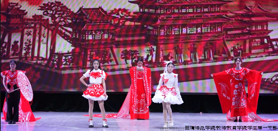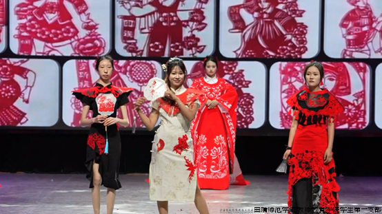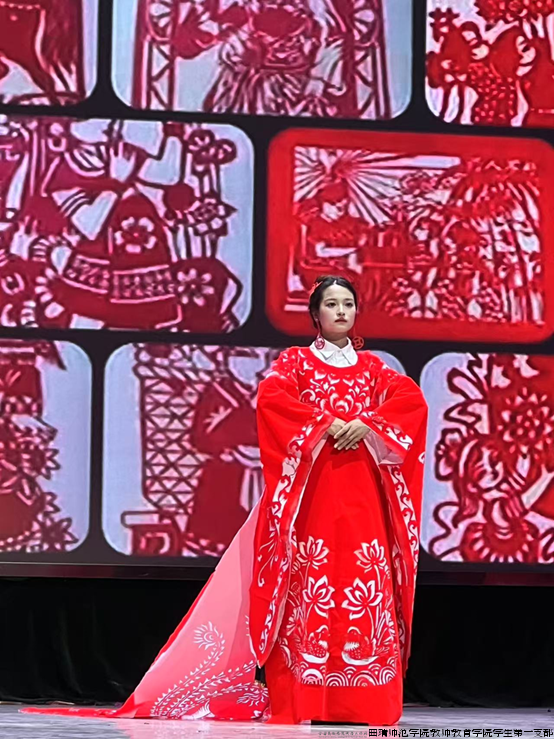 伴随着悠扬典雅的音乐,身着剪纸华服的学生款步上台,瞬间成为全场焦点。水袖轻扬时,衣袂间光影交错,仿佛一幅幅动态剪纸在舞台上徐徐展开,光影交错间,那些细腻的镂空、精巧的线条仿佛都跳动起来,演绎着无声却震撼人心的文化故事。台下观众仿若穿越时空隧道,既领略到传统剪纸艺术的精妙绝伦,又感受到时尚走秀带来的现代美感,古今交融,让人沉醉其中,掌声雷动。